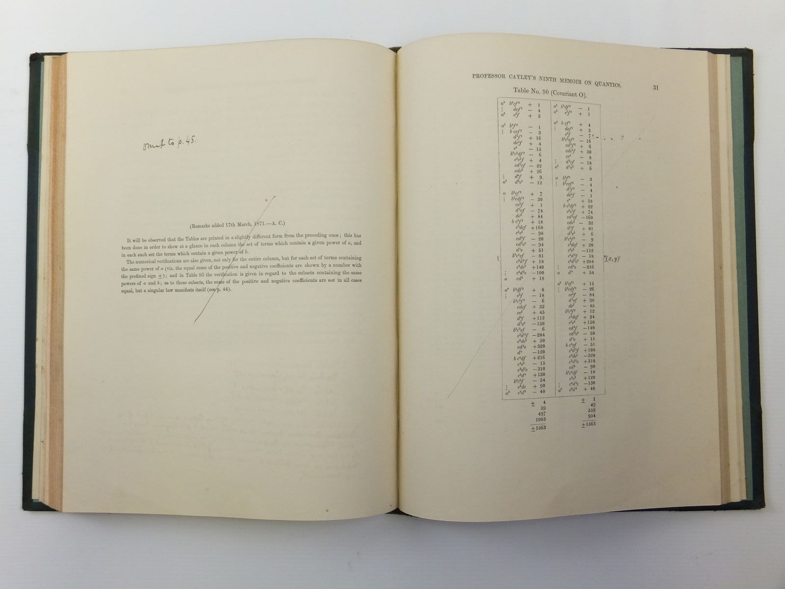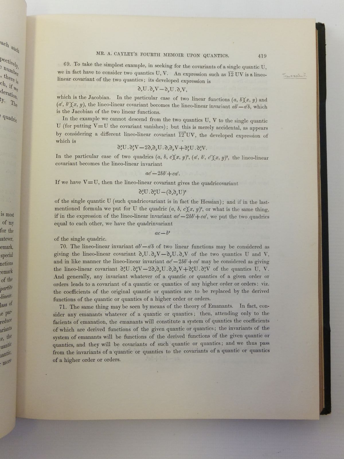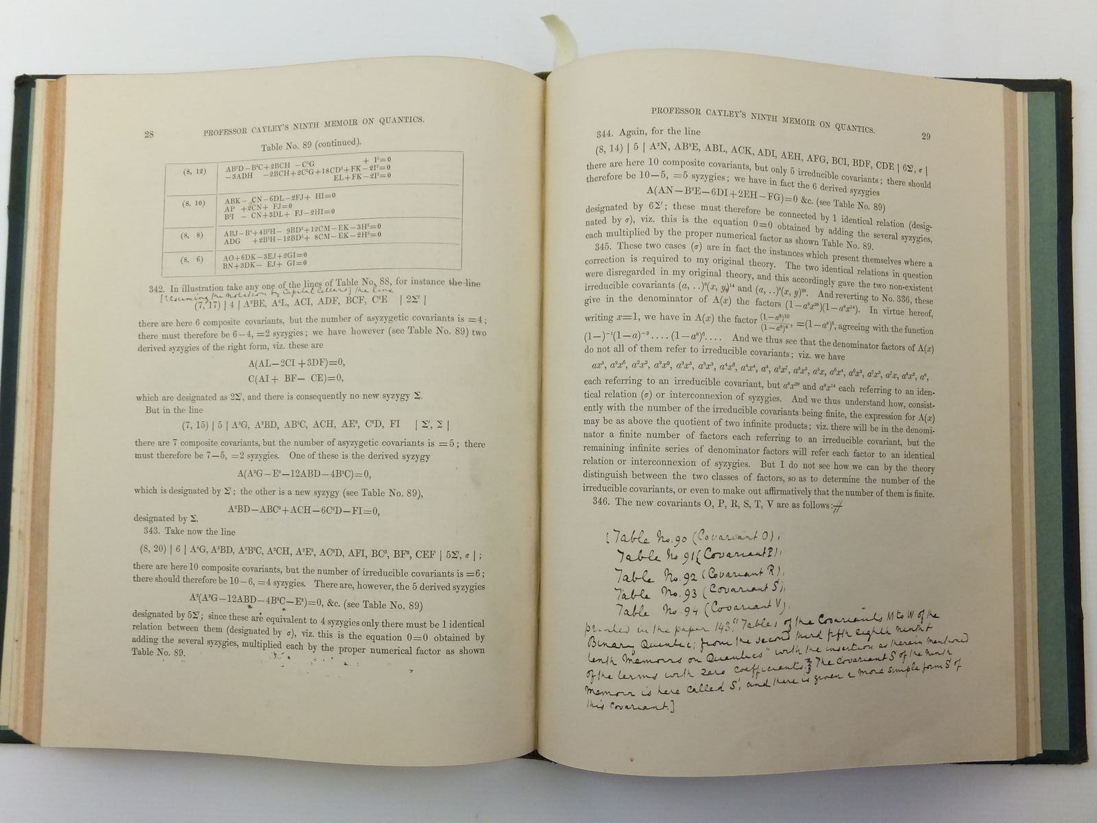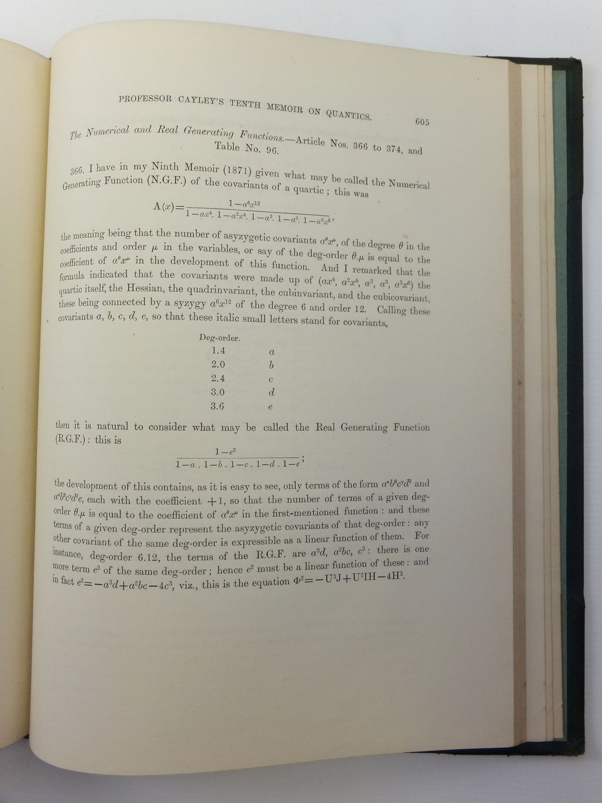 Almost very good condition. Large format. Green leather spine and corners; raised bands to spine. These 10 memoirs have been extracted from the 'Philosophical Transactions of the Royal Society of London' published 1854-1879 - the contents have then been bound together into one volume (Note - for this reason - not all page numbers are sequential). The author Cayley was an English mathematician and leader of the British school of pure mathematics that emerged in the 19th century. His work on matrices served as a foundation for quantum mechanics.