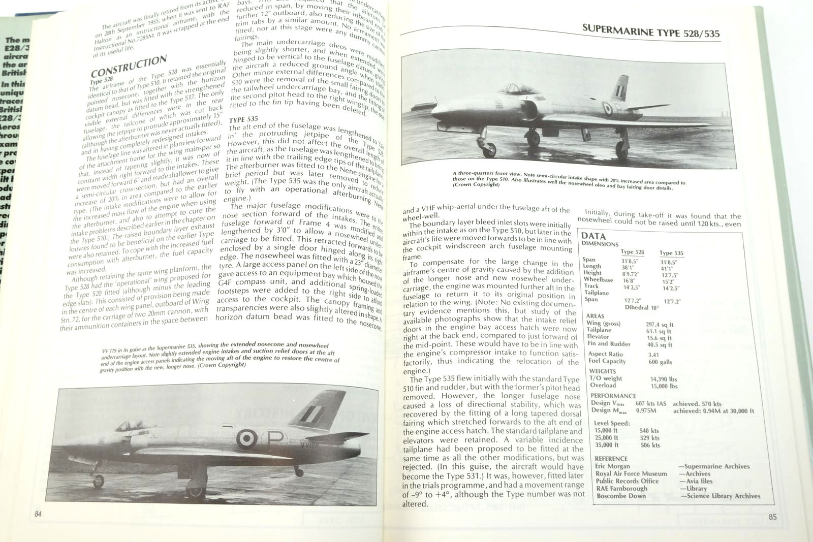 Slightly better than very good condition in a slightly better than very good dustwrapper. The development of British jet aircraft, from the E28/39 to the British Aerospace EAP in 1986, through an in-depth examination of experimental or prototype jets of the period. Each aircraft description is concluded with a 3-view, original 1/72 scale drawing. Large format. Blue cloth boards, silver title to spine. B/w photos. 272 pages.