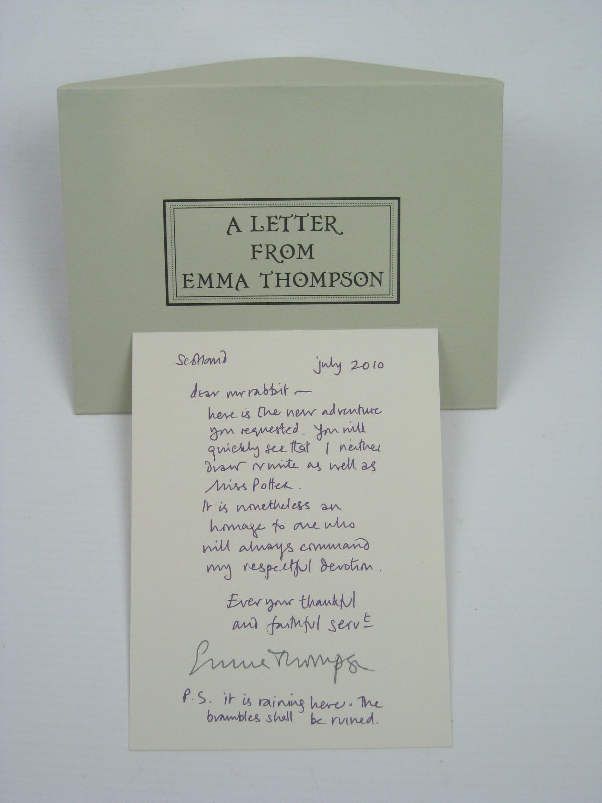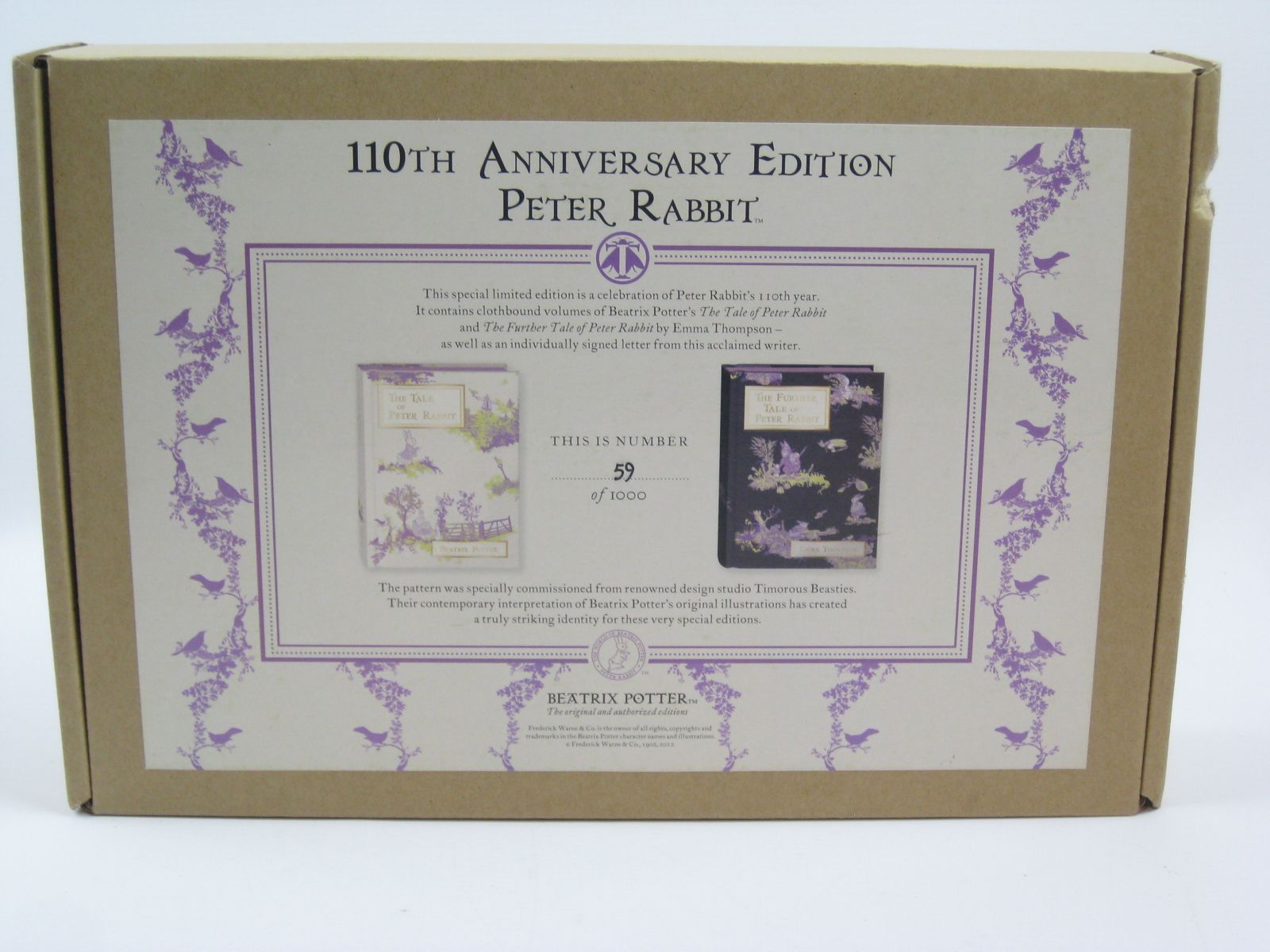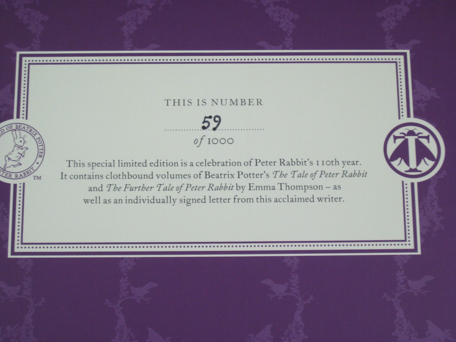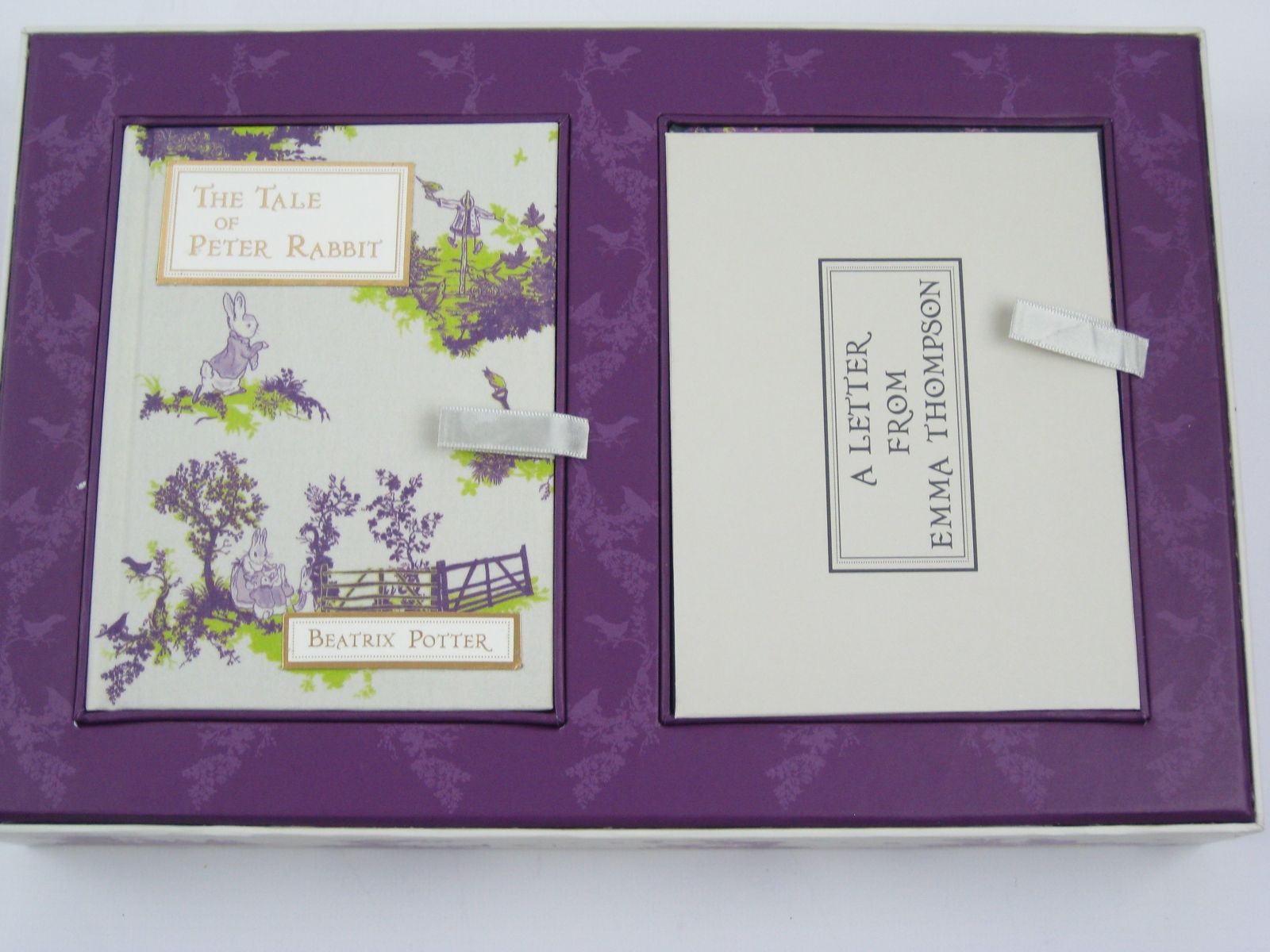 Fine condition. Special limited edition (of 1000 copies) being a celebration of Peter Rabbit's 110th year. It contains clothbound volumes of Beatrix Potter's The Tale of Peter Rabbit and The Further Tale of Peter Rabbit by Emma Thompson - as well as an individually signed letter from this acclaimed writer. The cloth pattern was specially commissioned from renowned design studio Timorous Beasties.