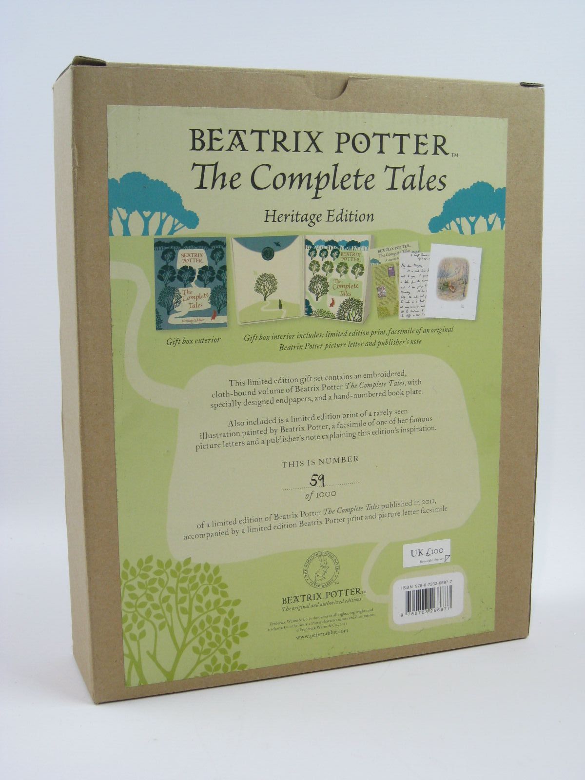 Fine condition. Heritage Edition. Limited edition set (1000 copies) containing an embroidered, cloth-bound volume of Beatrix Potter The Complete Tales, with specially designed endpapers, and a hand-numbered book plate. Also included is a limited edition print of a rarely seen illustration painted by Beatrix Potter, a facsimile of one of her famous picture letters and a publisher's note explaining this editions inspiration.