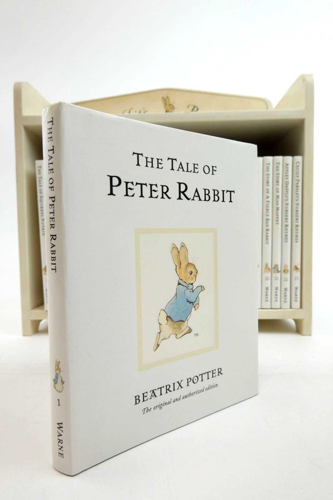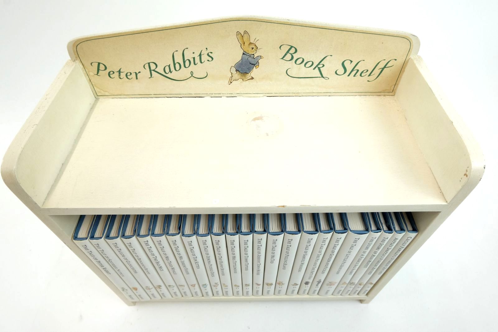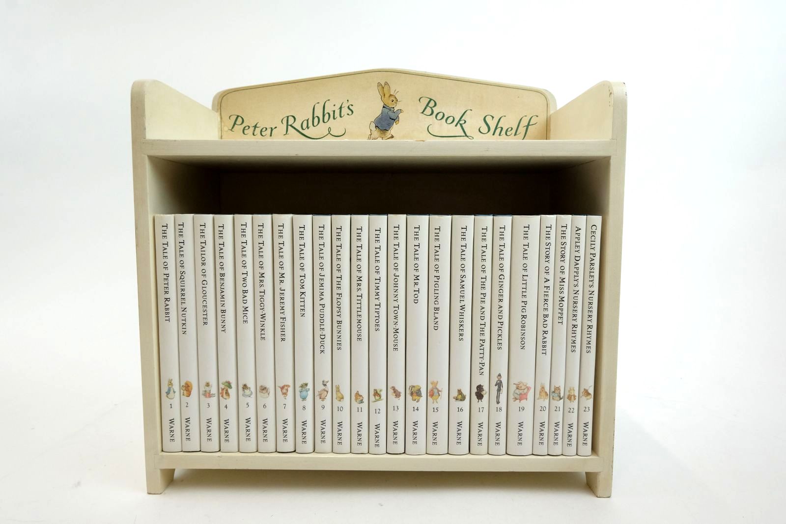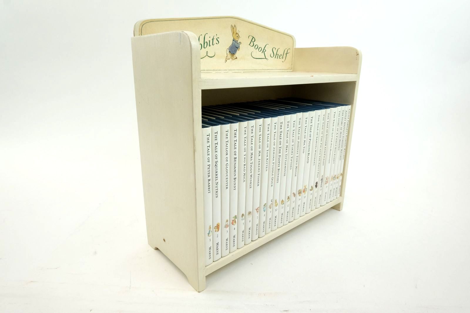 Very good condition in a very good dustwrapper. Complete set of the Peter Rabbit books (with blue boards, colour and b/w pictures). 23 books in total housed in original Peter Rabbit wooden bookshelf.