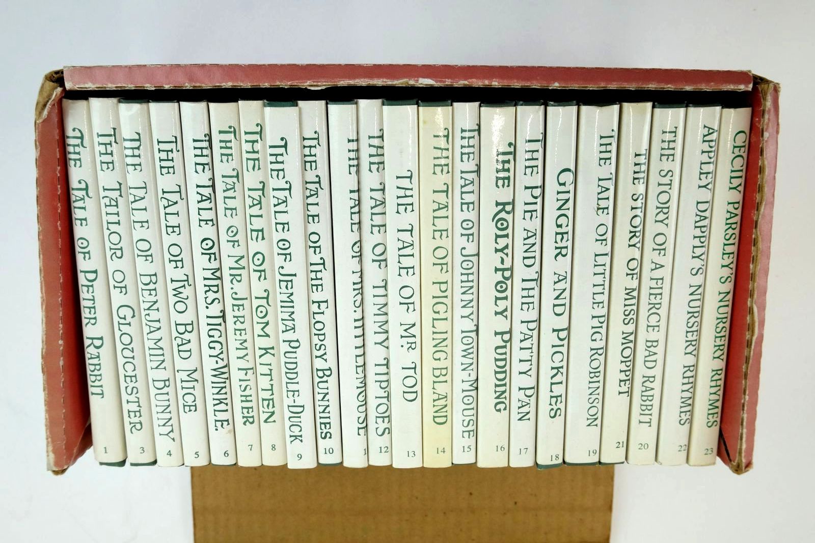 Unfortuntely one volume is MISSING from this set (no. 2 Squirrel Nutkin). Some slight rubbing to the cover edges and some slight creasing to the dustwrappers. The box is worn, scuffed and rubbed.
