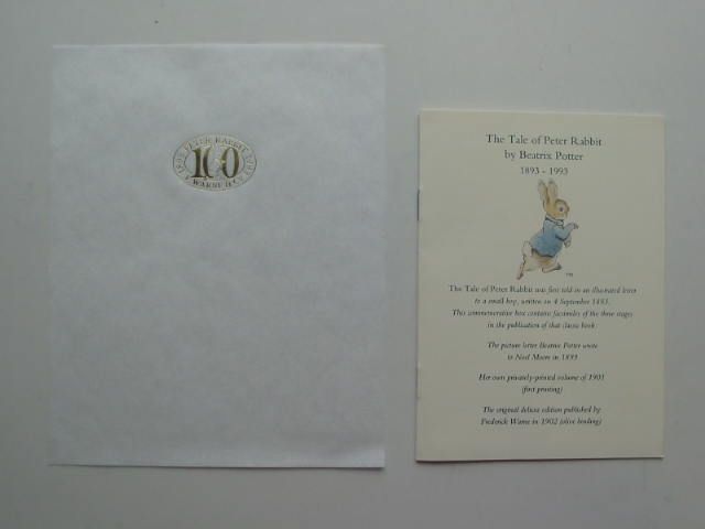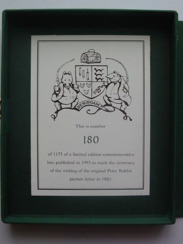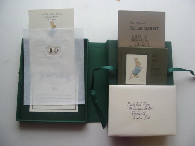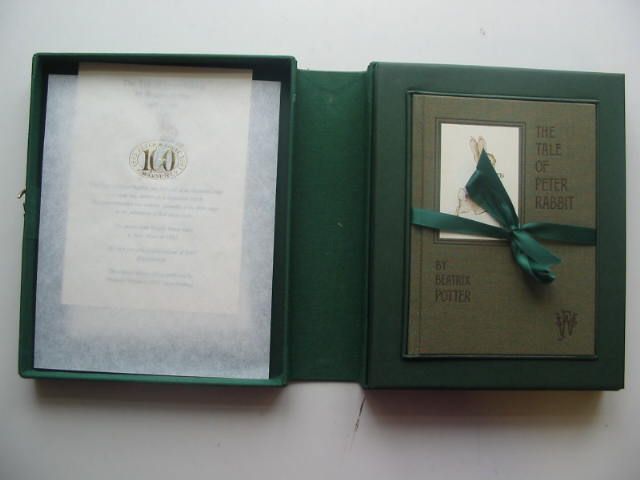 Fine condition. Special Limited edition boxed set, (limited to 1175 copies); issued to commemorate the 100th anniversary of the publication of The Tale of Peter Rabbit. This commemorative box contains facsimiles of the three stages in the publication of this title: the picture letter Beatrix Potter first wrote to Noel Moore in 1893, her own privately-printed volume of 1901 (the first printing), and the original deluxe edition published by Frederick Warne in 1902 (olive binding). A small stapled pamphlet on the history of publication is included, as is a gilt embossed tissue guard to protect the limited edition plate on the interior of the box. The box is dark green cloth with a brass latch and has a gilt title to spine. A beautiful edition for the collector!