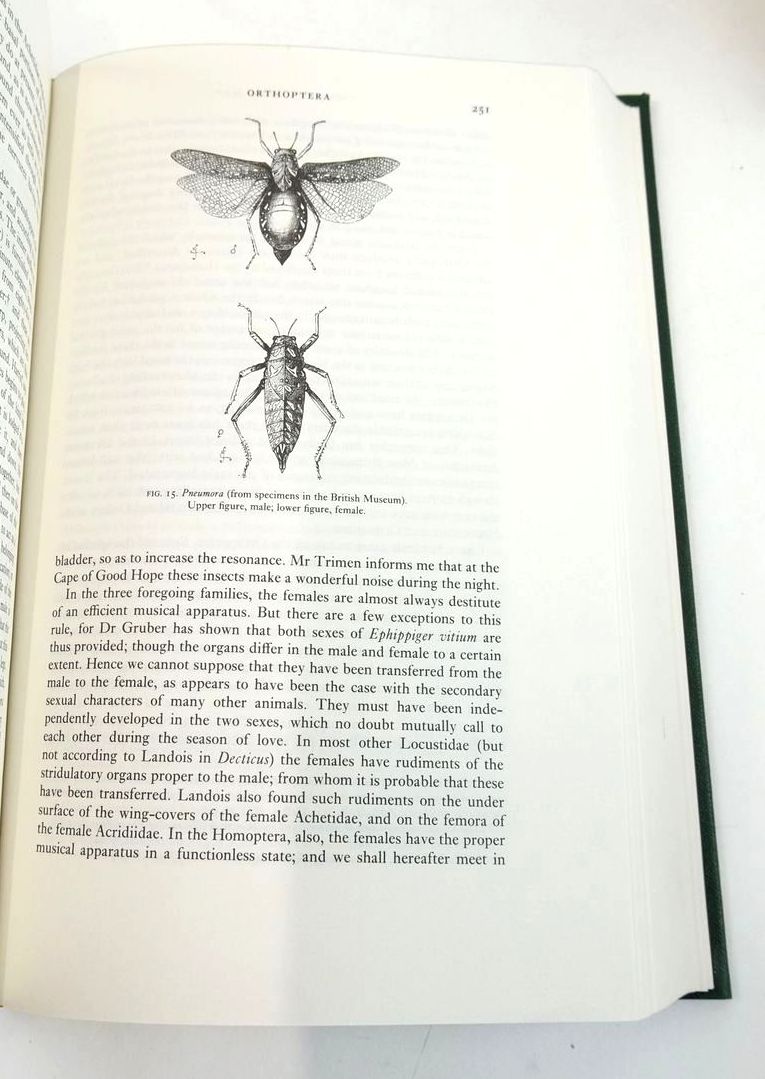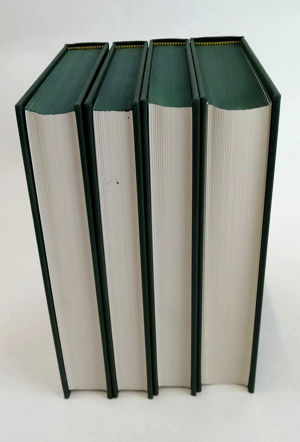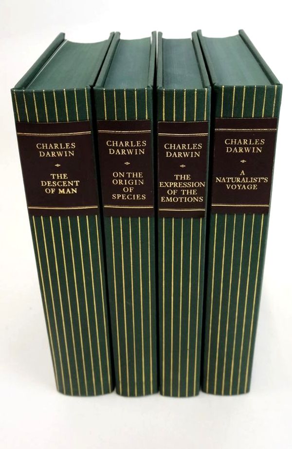 Very good condition. Contains four volumes: The Descent of Man; On the Origin of Species; The Expression of the Emotions; and A Naturalist's Voyage. Green cloth, gilt lined front board and spine. Brown leather title labels to spine with gilt titles. B/w illustrations. Top edge of each volume is green.