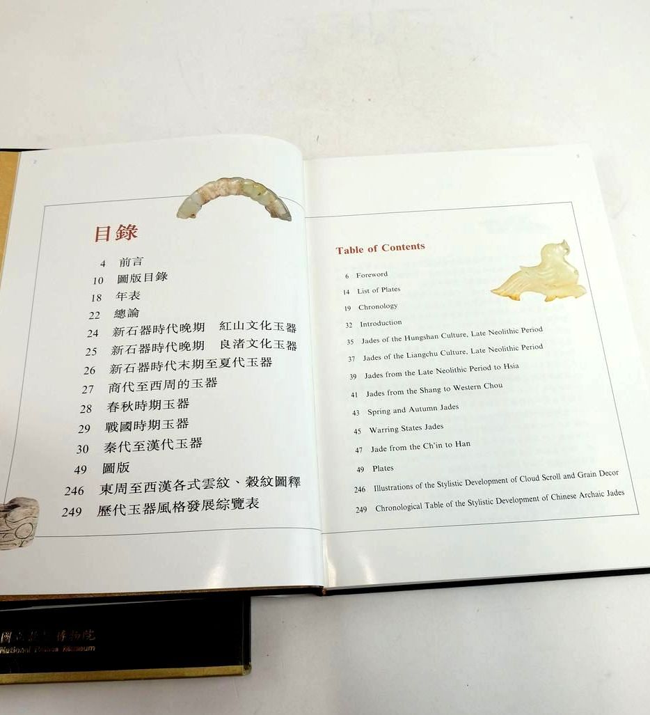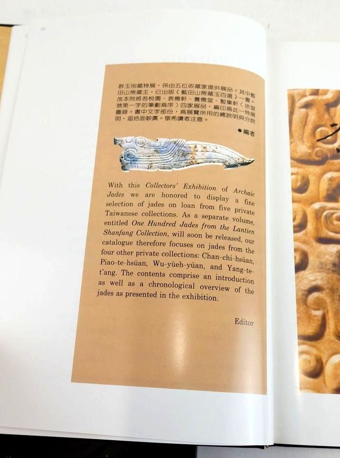 Nearly fine condition in a nearly fine dustwrapper. Staged in celebration of the National Palace Museum's 70th anniversary, the exhibition Collectors' Exhibition of Archaic Chinese Jades ecncompasses the finest pieces from five private collections. Large format. Black cloth boards with gilt Chinese title and silver English title. Gilt endpapers. Colour photos. Text in Chines and English. 247 pages plus fold-out chart to rear.