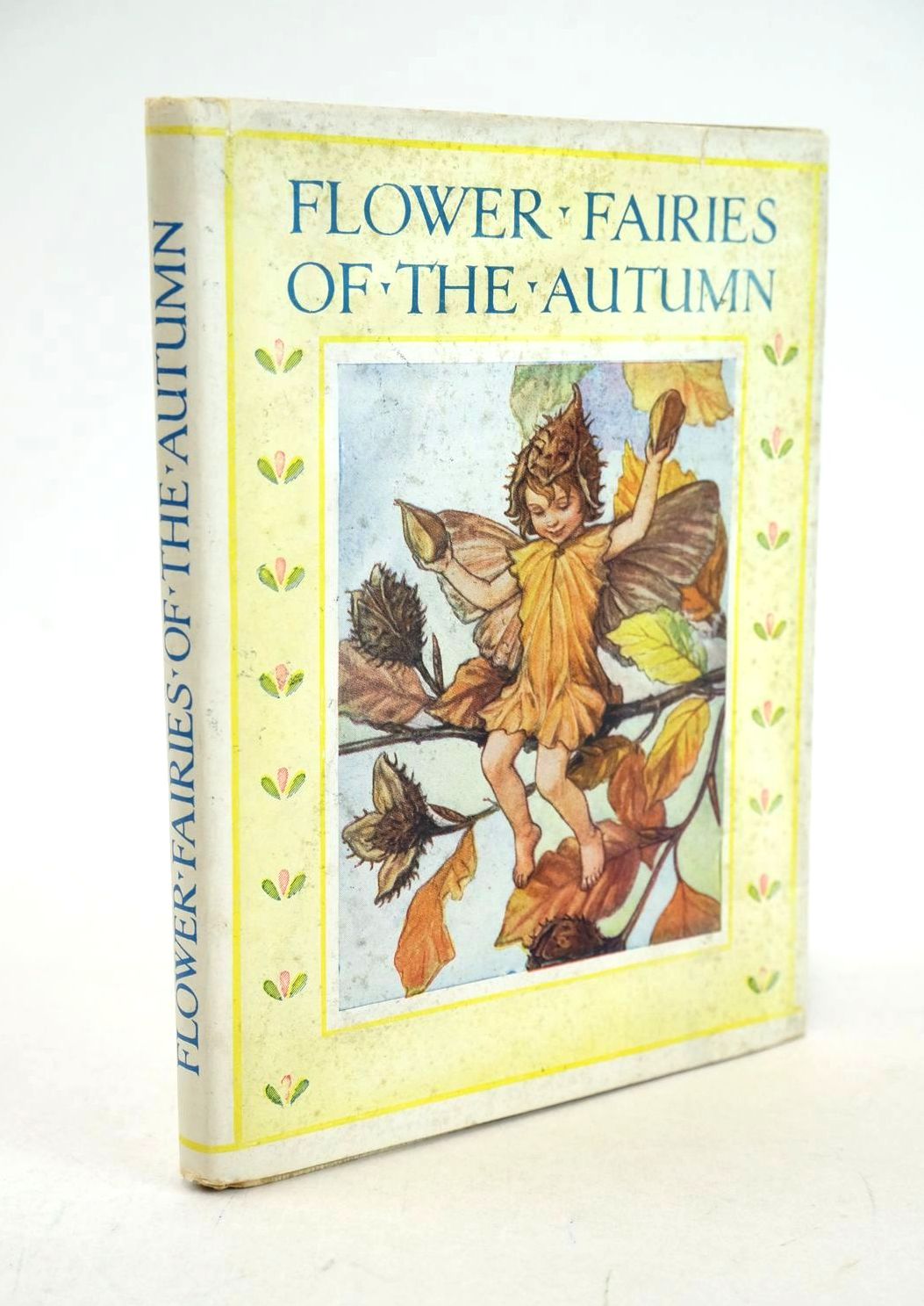 From Flower Fairies of the Autumn. Grey paper boards with blue titles, blue cloth spine. Pictorial onlay to front board. 12 poems with accompanying tipped-in colour plates and music by Linnell. A lovely book. Spine bumped and worn with a couple of marks. Wear to corners with some loss of surface from top corner of front cover. Rear cover is marked (water?) with light crease to bottom corner. Ink inscription to front endpaper. Light stains to bottom edges of endpapers and some pages. Foxing throughout. All plates present and in very good condition. Dustwrapper is edge worn and chipped, also grubby with stains and with hole to centre of spine. Some tape repairs to tears on verso.