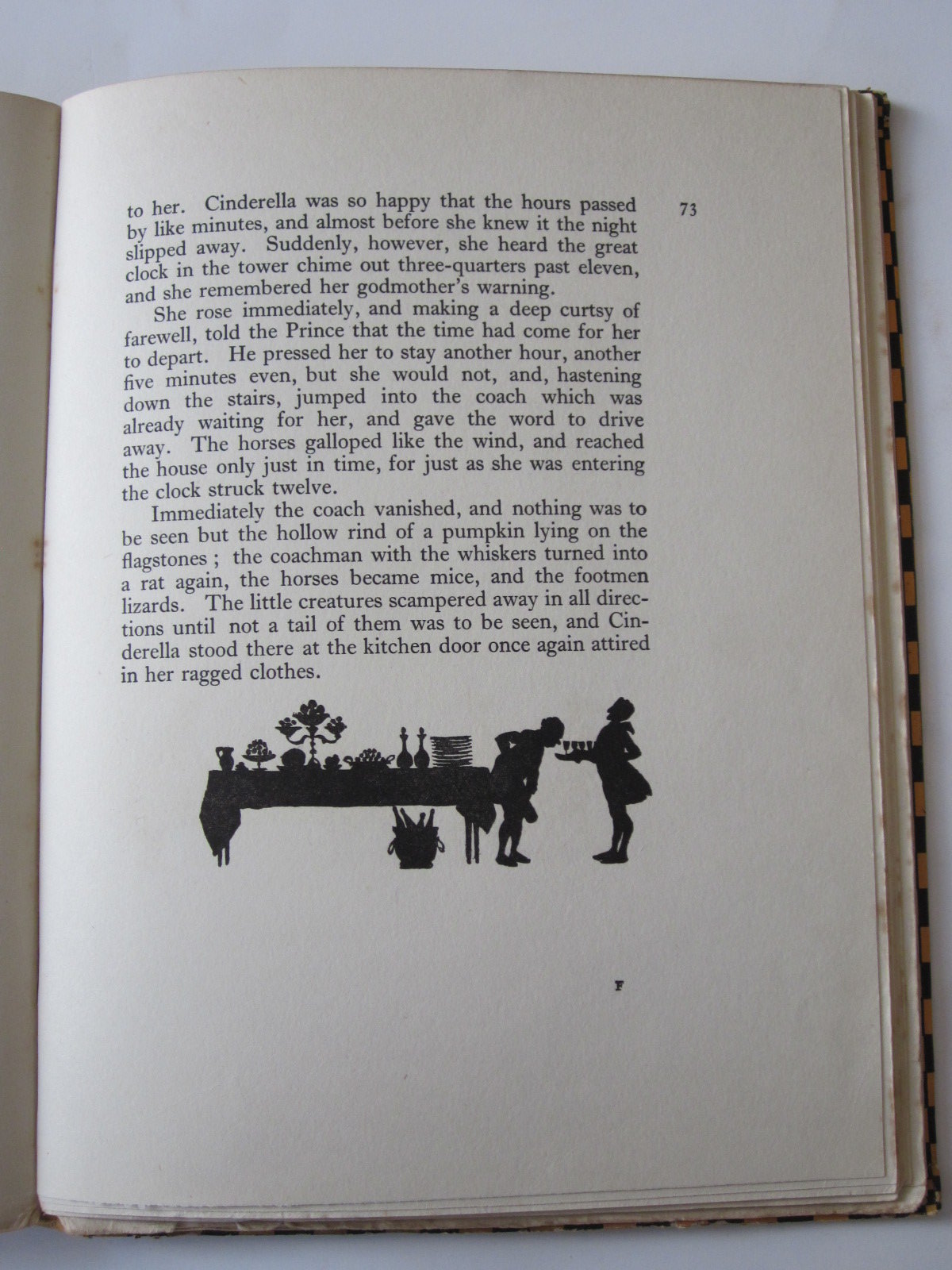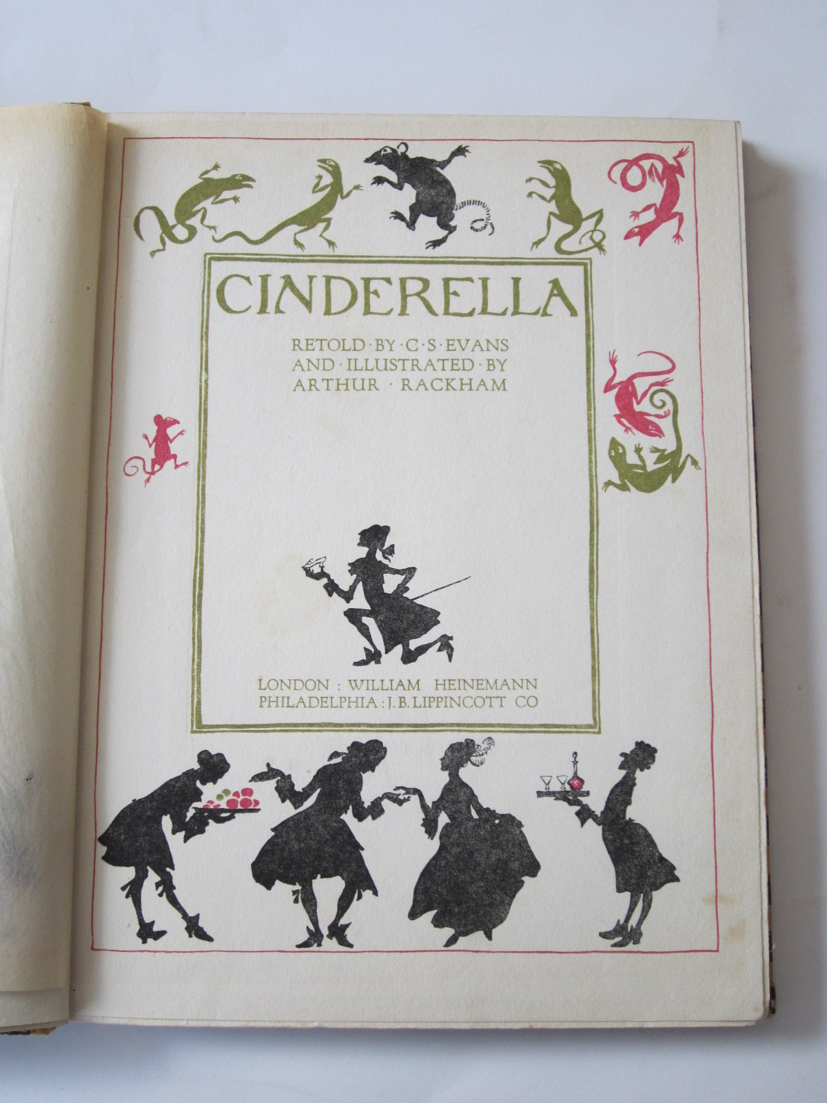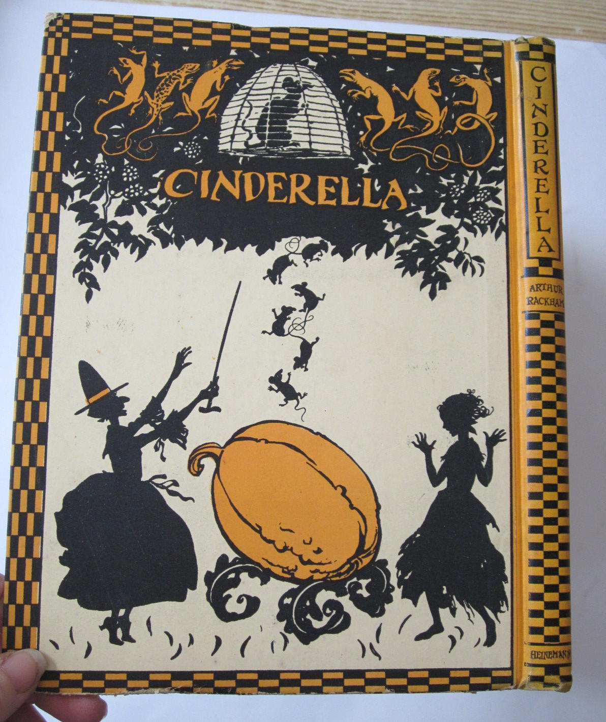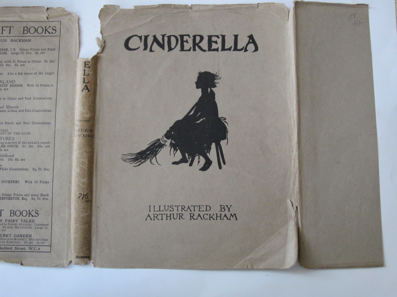 Very good condition in a good dustwrapper. Rackham's illustrations for Cinderella (and also Sleeping Beauty) differ from those in his previous books in that they rely almost entirely on silhouette for their effect. Typically, Rackham completely mastered this new medium, successfully evoking the character of each protagonist through gesture and profile alone. Colour frontis, three double-page silhouette colour illustrations, 14 single page in black-and-white. Orange and black pictorial boards showing Cinderella with the magic pumpkin, rats and the Fairy Godmother. Green/white pictorial endpapers. 110 pages. 10 x 7.5 inches. An extremely striking book.