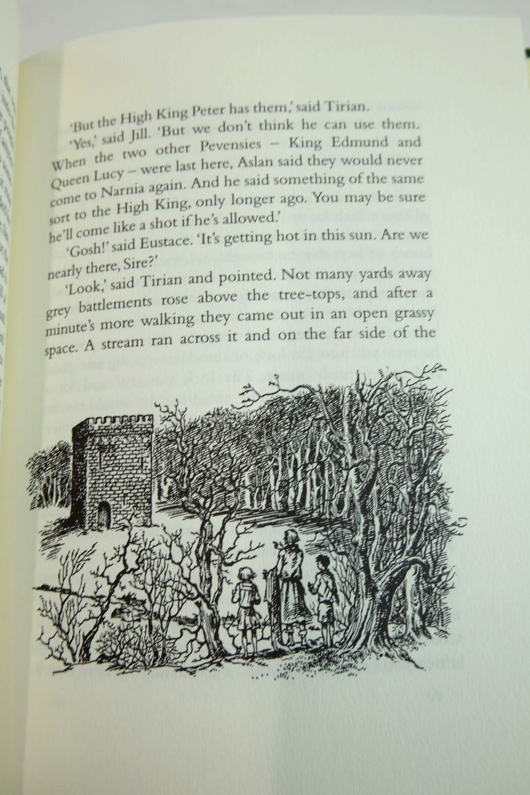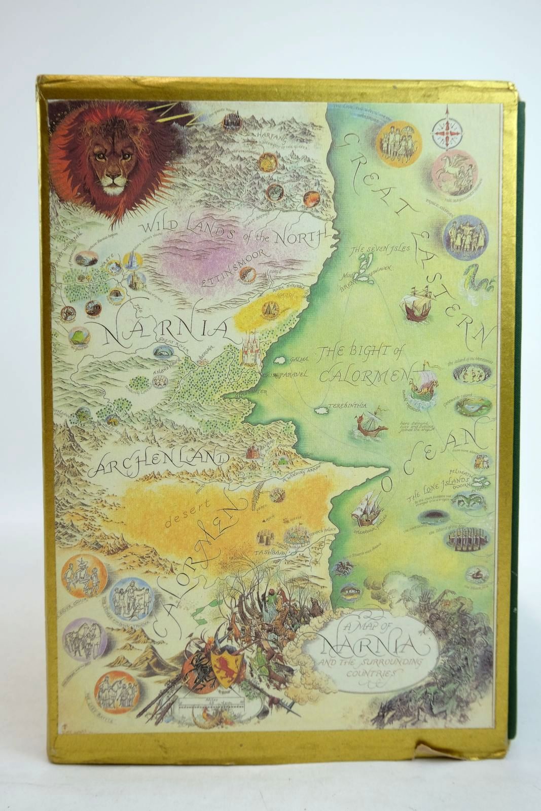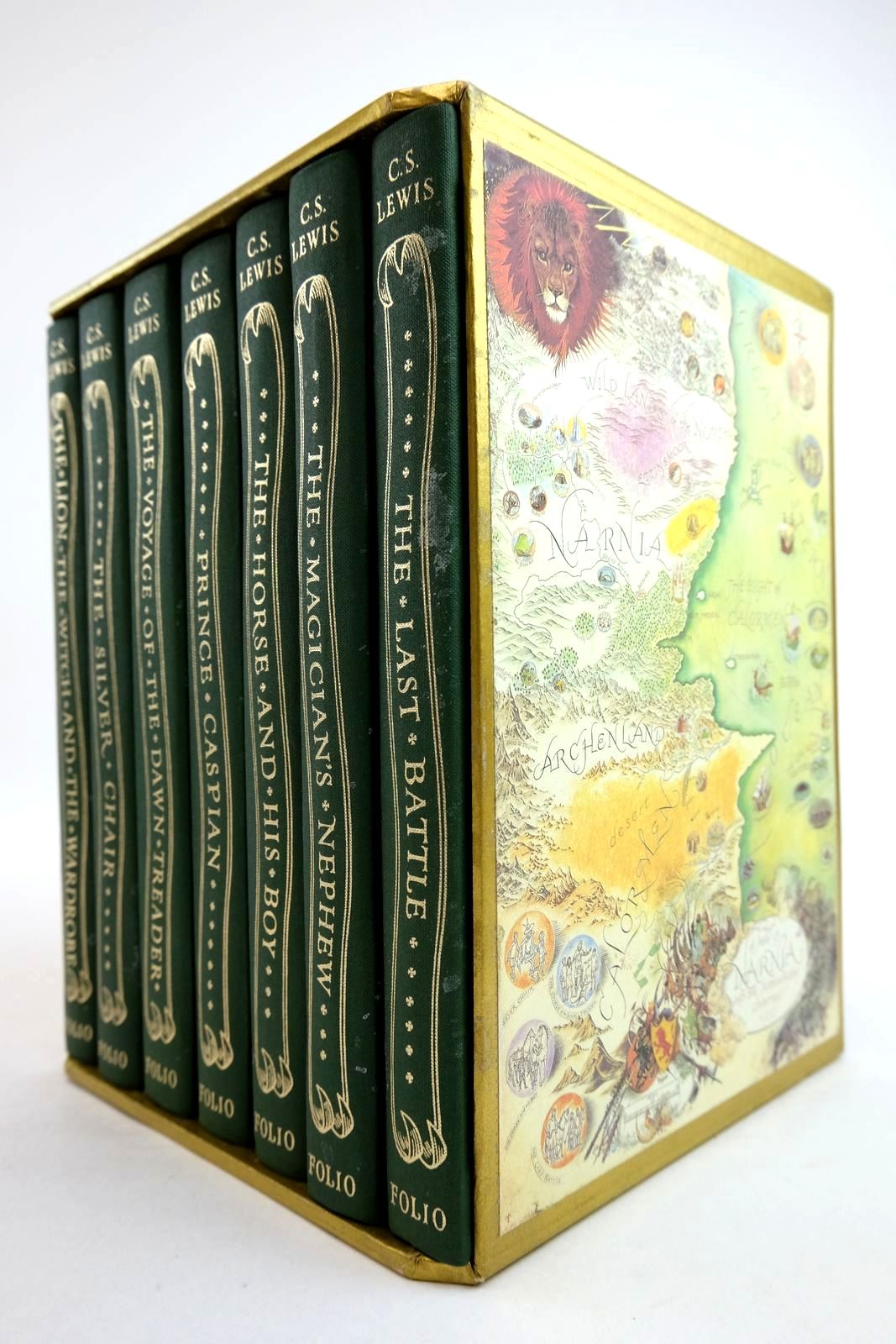 Slightly better than very good condition. 7 volumes bound in green cloth with gilt title to spines and attractive gilt decorations to front covers. B/w illustrations throughout. Contained in gold coloured slipcase with colour map of Narnia on both sides.