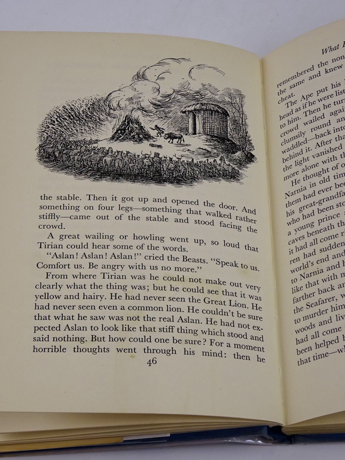 Very good condition in a almost very good dustwrapper. The seventh and last of the Narnian stories. Blue boards, silver title to spine. B/w illustrations.