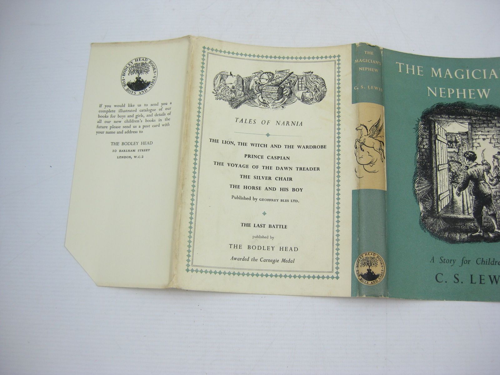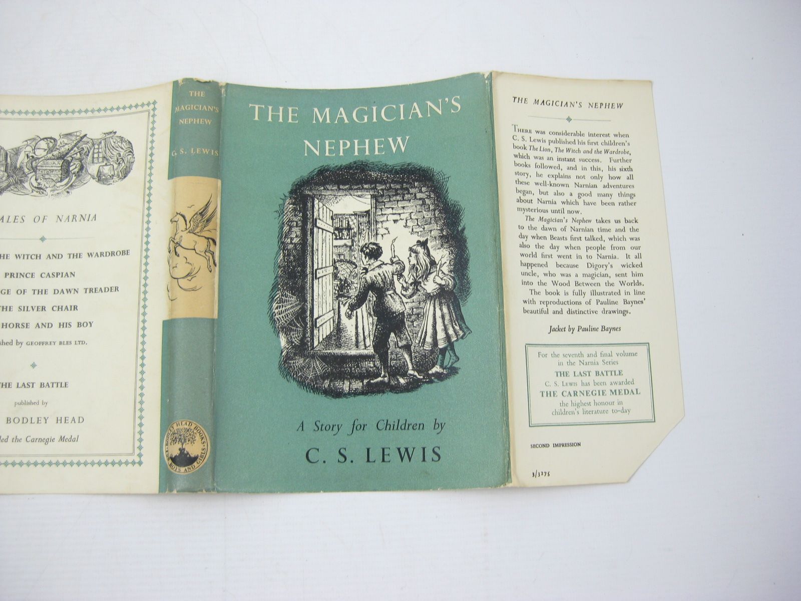 Very good condition in a very good dustwrapper. The sixth in the 'Narnia' series but the one in which it is explained how all the adventures began. Green boards. Silver title to spine. B/w drawings. 183 pages. 8 x 5.5".