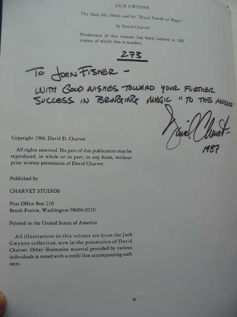 SIGNED by author 'To John Fisher, With Good Wishes Toward your Further Success in Bringing Magic To the Masses' David Charvet 1987. Copy no. 273. From the library of John Fisher who was a Gold Star Member of the Inner Magic Circle and former curator of the Magic Circle Museum, also TV producer of magic shows and an author in his own right.
