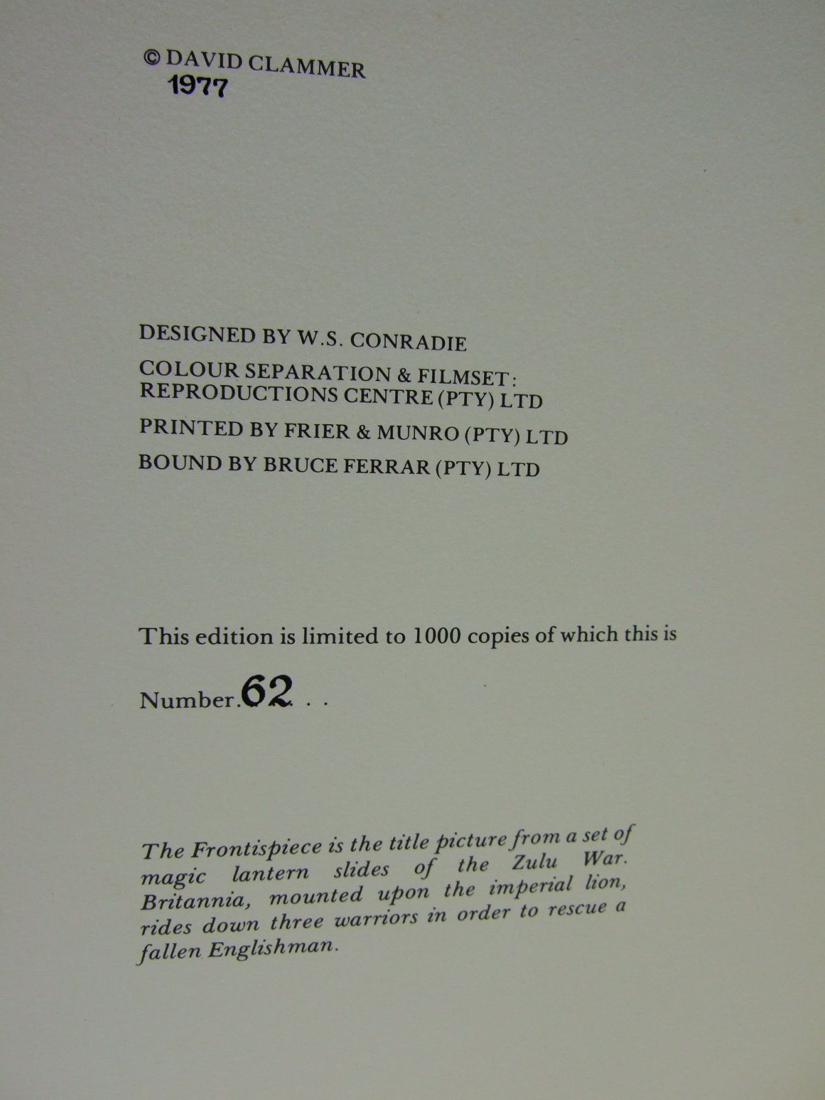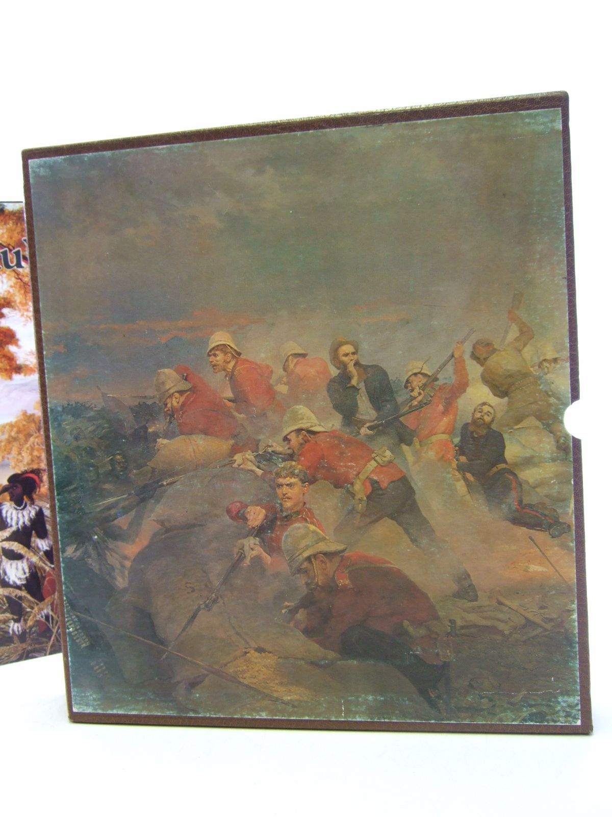 Very good condition in a very good dustwrapper. The story of the last Zulu war. Large format. Brown imitation leather cloth boards with gilt title to spine and Zulu vignette to front. Colour & b/w illustrations. 240 pages including index. Limited to 1000 copies. Contained in brown slipcase with large pictorial onlay of the Zulu war to both sides.