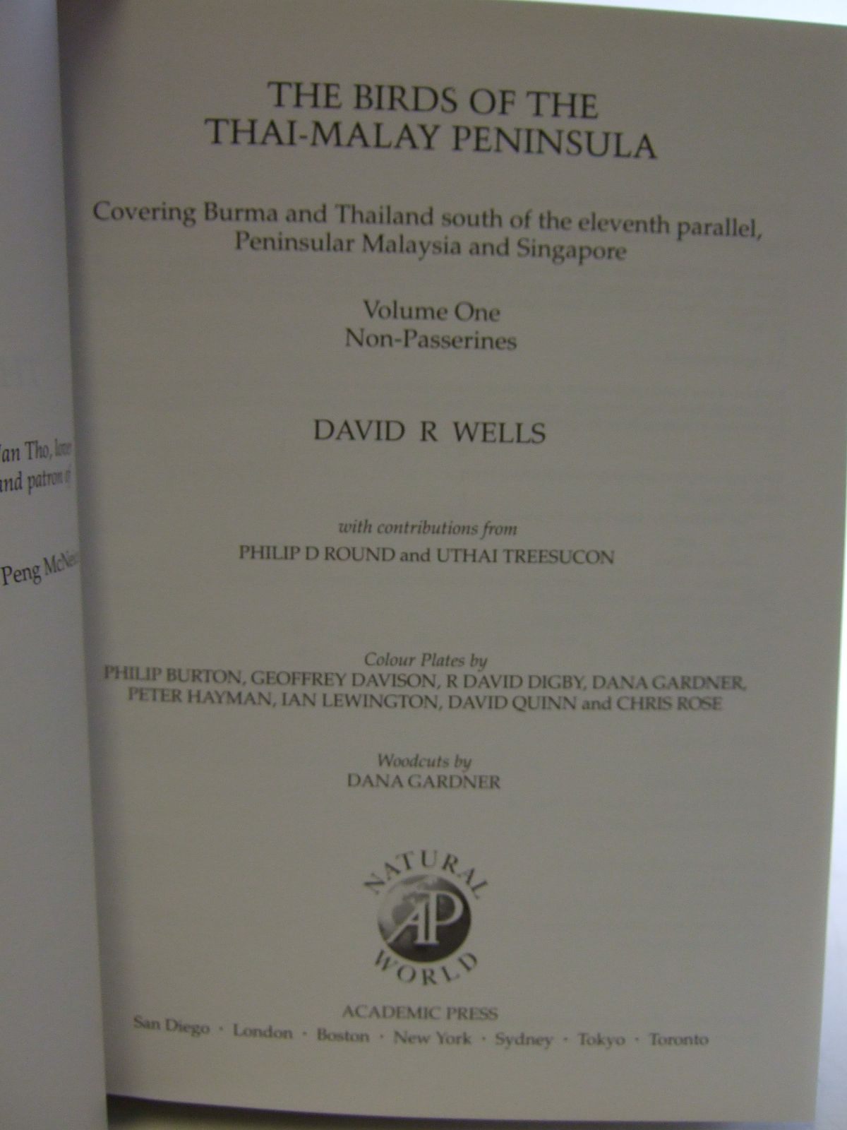 Nearly fine condition in a nearly fine dustwrapper. Two volumes. Covering Burma and Thailand, South of the 11th Parallel, Peninsular Malaysia and Singapore. Volume One Non-Passerines ISBN: 0127419611. Volume Two Passerines ISBN: 9780713665345. Colour plates, distribution maps. Coverage of systematics, distribution, identification and biometrics, voice, plumage and moult, variation, status and population, habitats and ecology, feeding, social behaviour, breeding biology and conservation.
