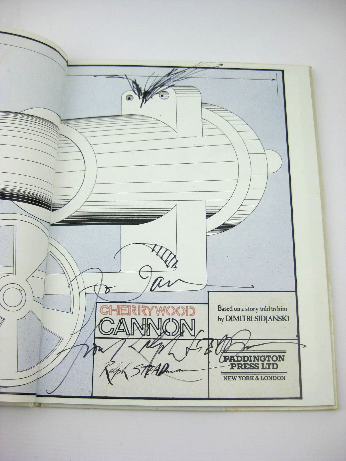 SIGNED by the artist to title-page with a small doodle to the cannon illustration. Small nibble patch to base of spine of book. Ink (biro) 2.00 written to top corner of front free-endpaper. Some loss to lower spine corner of front panel of wrapper (where it was nibbled). Dustwrapper is lightly browned, some lifting of laminate at lower edge of front panel.