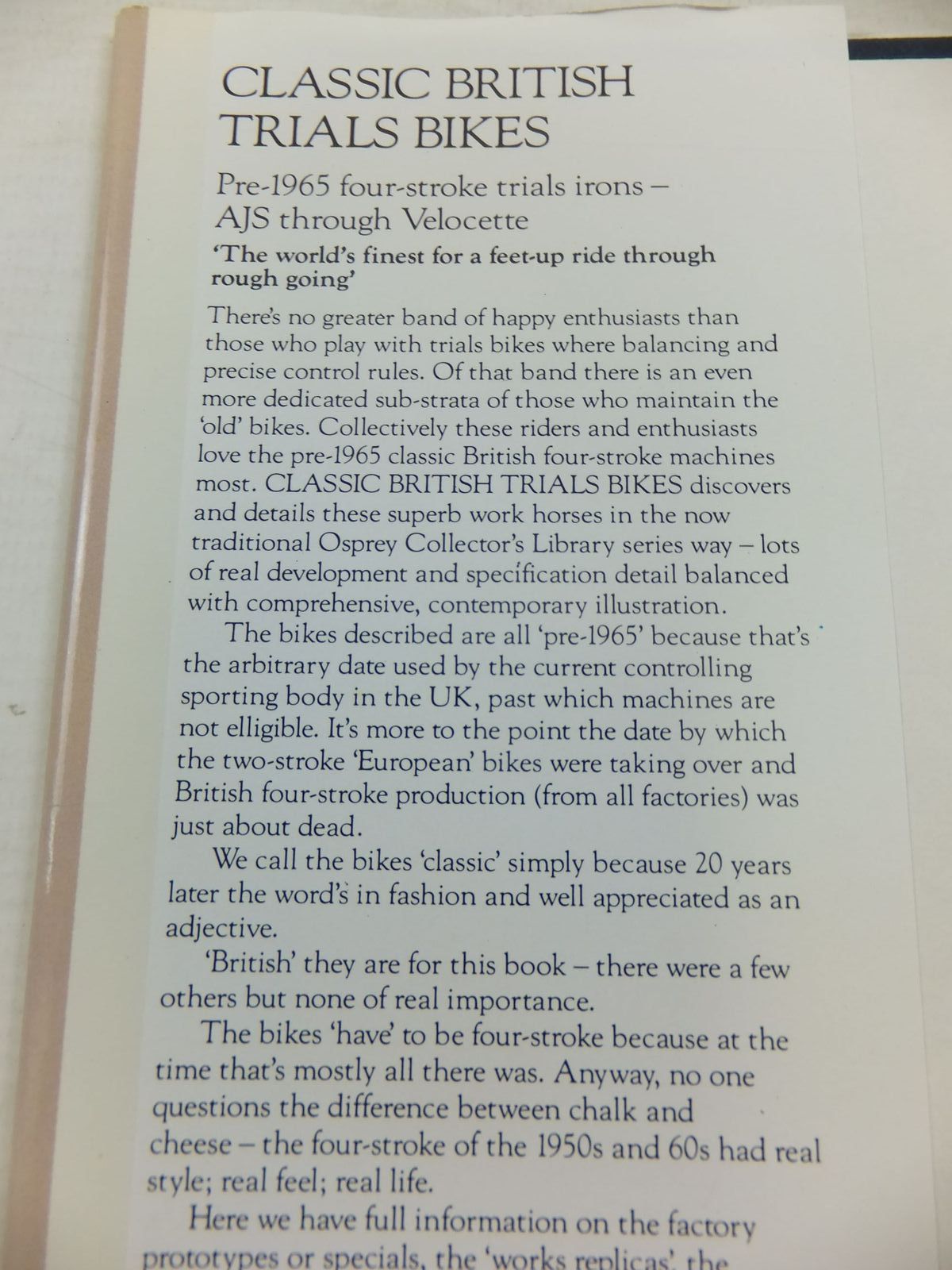 Fine condition in a nearly fine dustwrapper. Pre-1965 four-stroke trials irons. AJS through Velocette. B/w photos. Osprey Collectors Library.