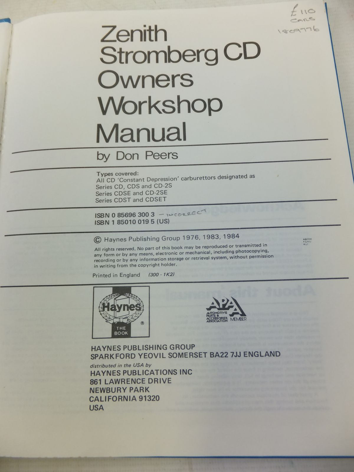 Slightly better than very good condition. Title to boards is 'Zenith Stromberg CD Carburettors: Tuning; Overhaul; Specification tables; Series CD (Constant Depression); to 1976. Large format. Blue glazed boards. B/w photos.