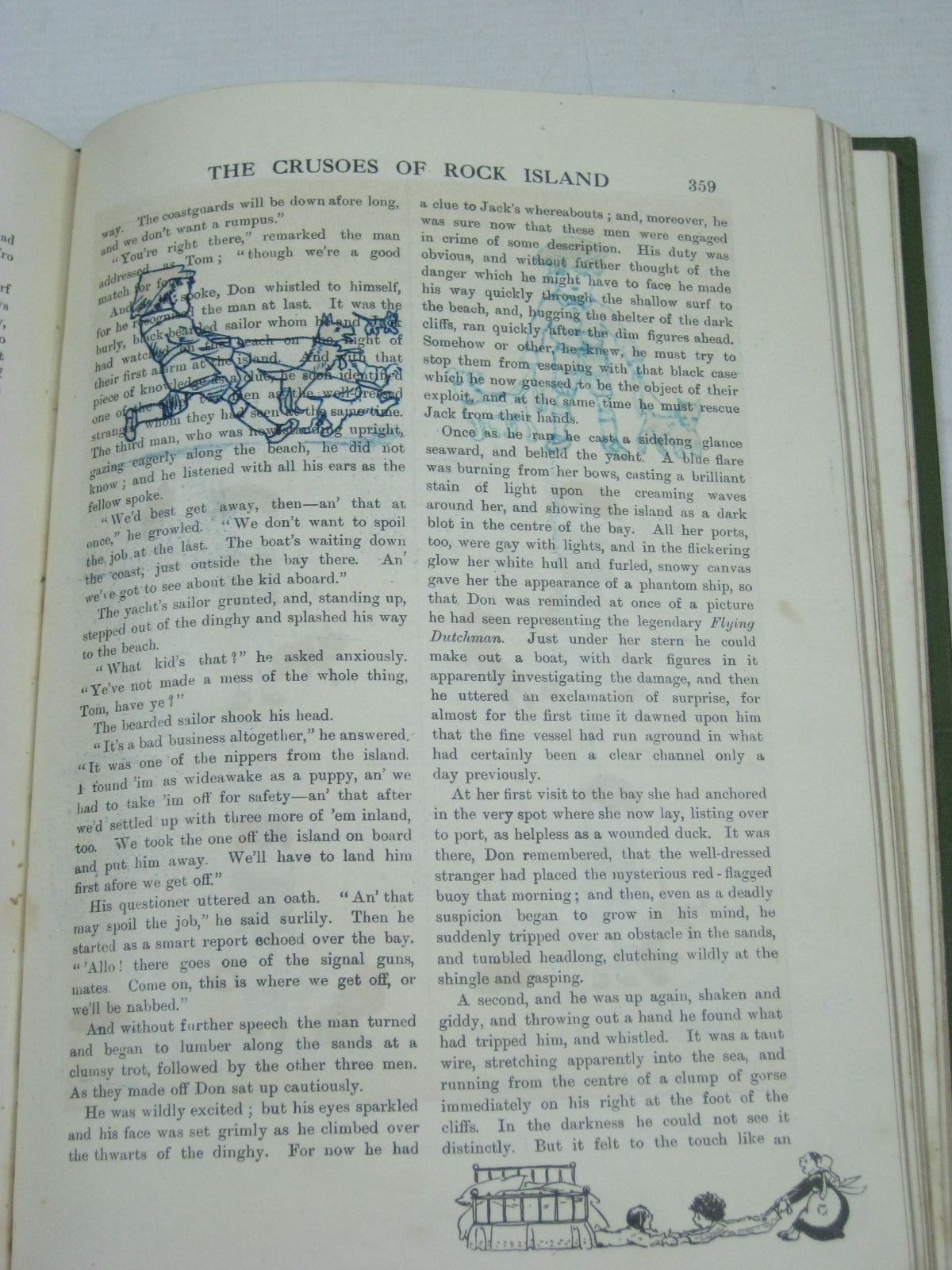 Spine and corners bumped and a little worn. A few light marks to rear board. Both joints cracked. Title page and prelims missing. Inscription to verso of frontis. Colouring to a few b/w illustrations. Biro has been used to outline some smaller illustrations. Biro drawing on reverse of one illustration which does affect a small part of text. Small hole to one colour plate. Some foxing and grubby margin marks.