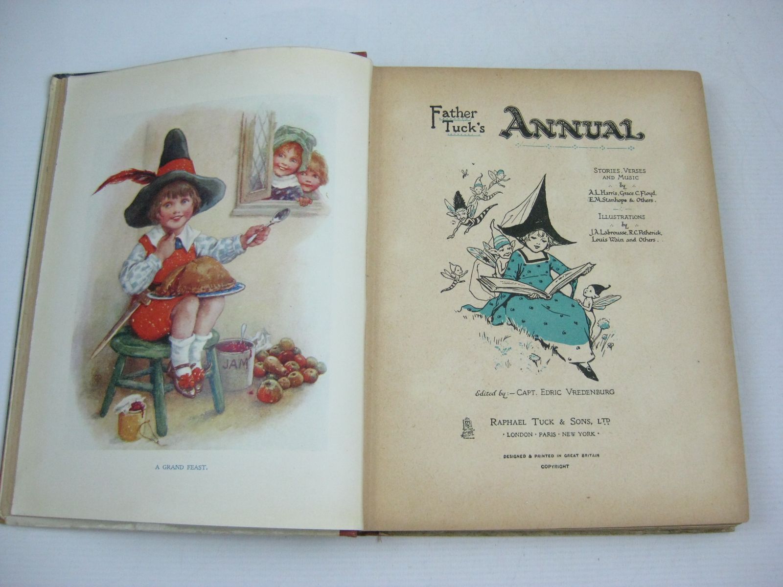 Almost very good condition. Red cloth spine with black titles and vignette. Pictorial front cover shows boy about to kiss girl under the mistletoe, she's holding teddy, dog in front. Edited by Vredenburg. 6 colour plates, incl. 2 by Wain. B/w and two-tone illustrations. 128 pages.