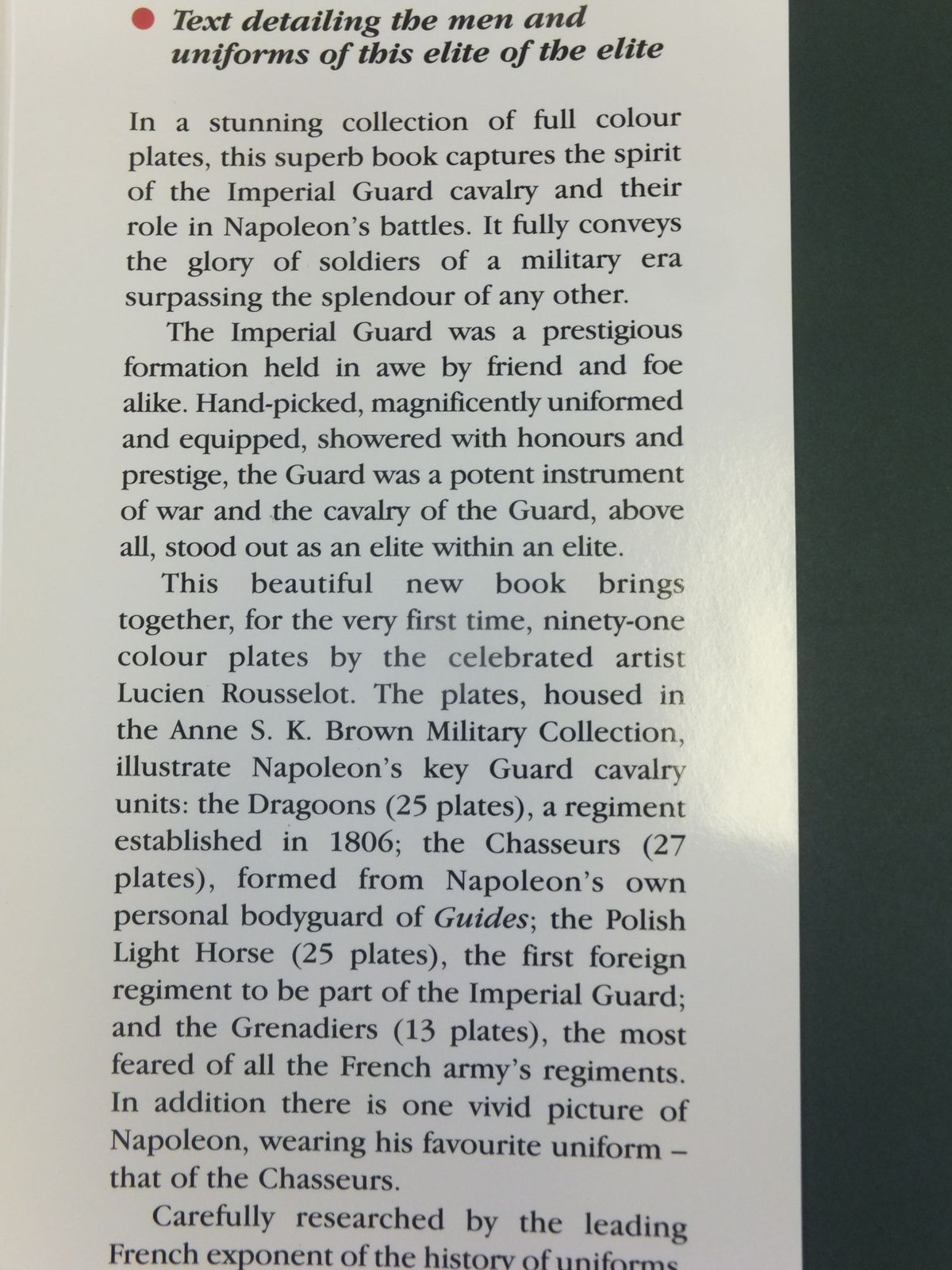 Fine condition in a fine dustwrapper. Cavalry of the Imperial Guard 1804-1815. 91 superb colour paintings of Lucien Rousselot. Large format. A lavish presentation of Napoleon's guard cavalry. Text by Ryan detailing the men and uniforms of this elite of the elite.