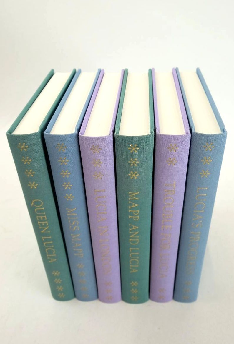 Nearly fine condition. 6 volumes, titles are: Trouble for Lucia; Lucia's Progress; Mapp and Lucia; Lucia in London; Miss Mapp; and Queen Lucia. Pastel colour cloth. B/w illustrations.
