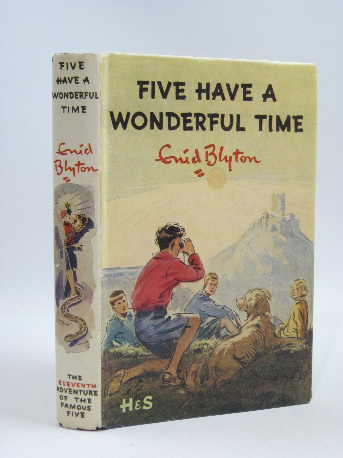 The 11th Famous Five adventure. Red boards, black lettering. Blue and black pictorial endpapers. B/w and two-tone illustrations. 192 pages. Minimal bumping to spine. Light browning to endpapers. Foxing to textblock. Dustwrapper is edge worn and torn with slight chipping, light foxing to flaps.
