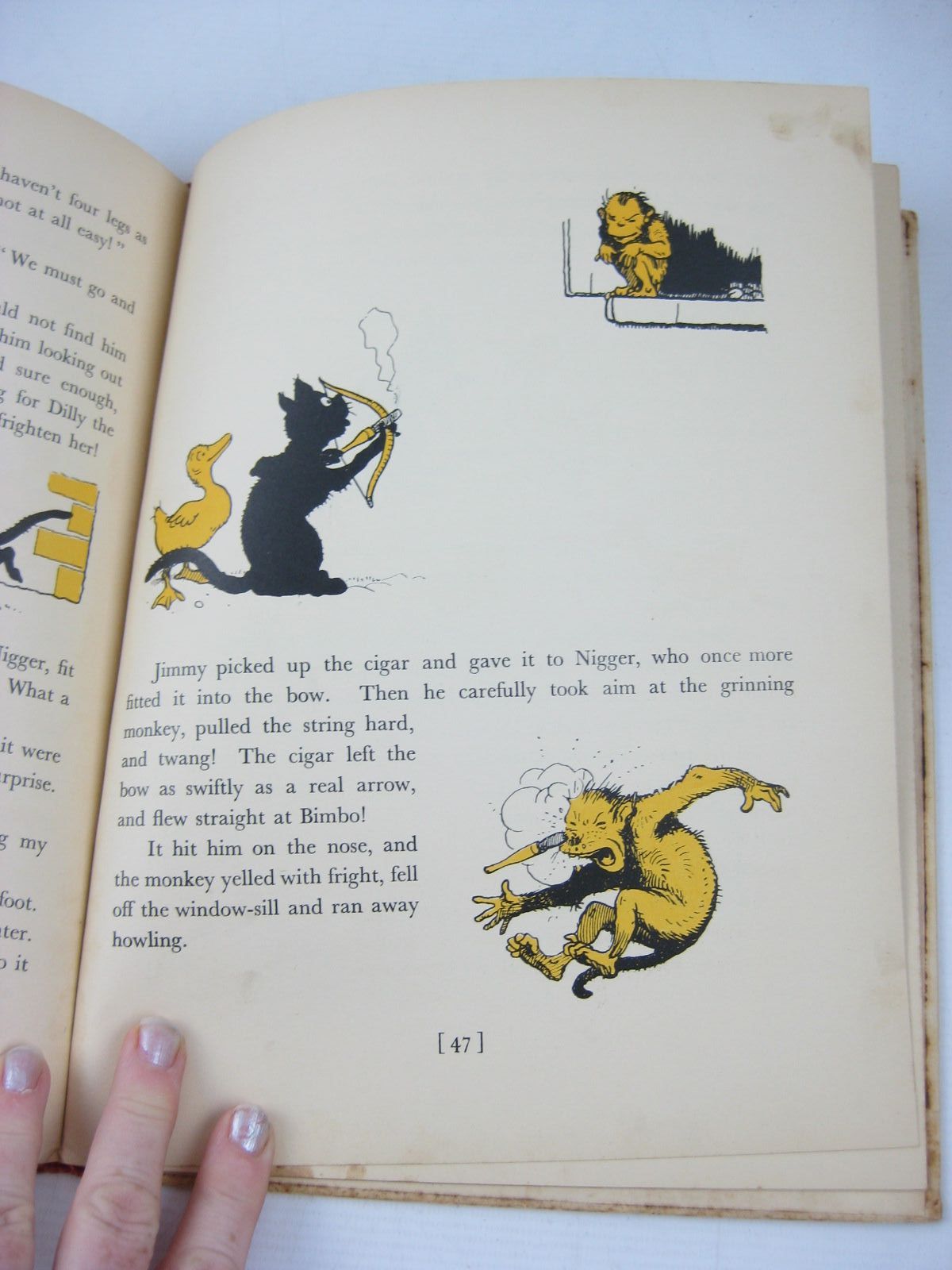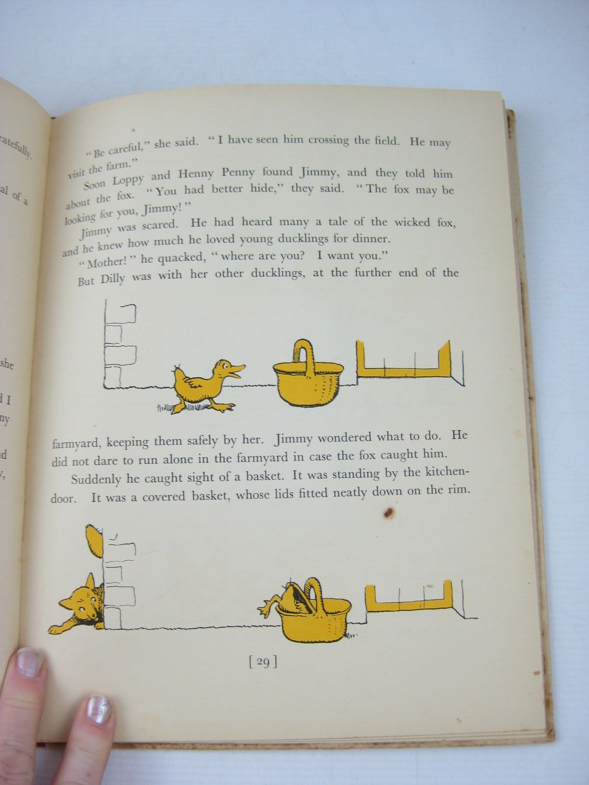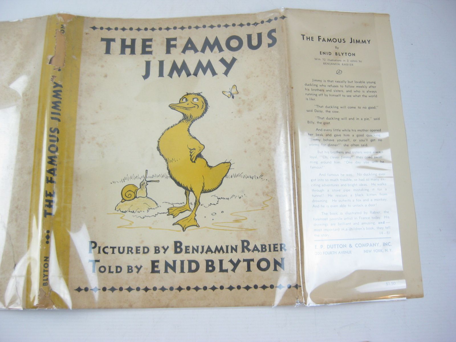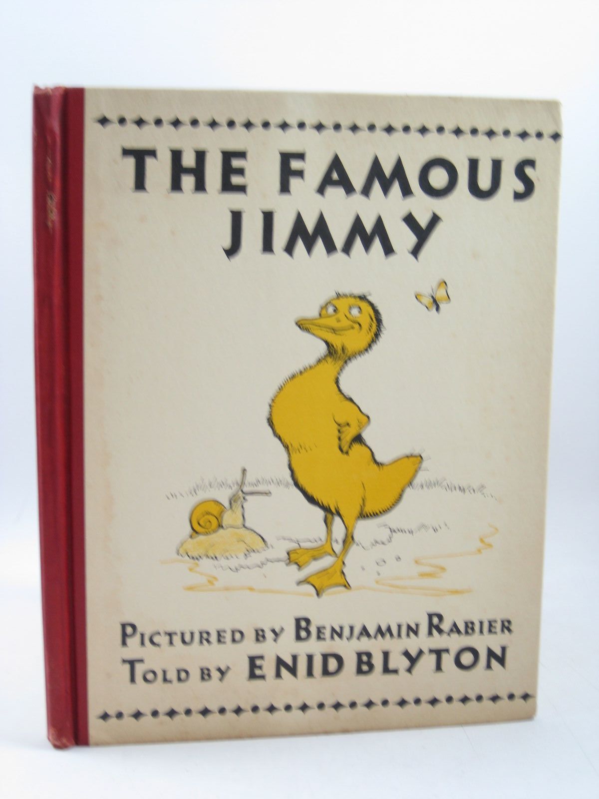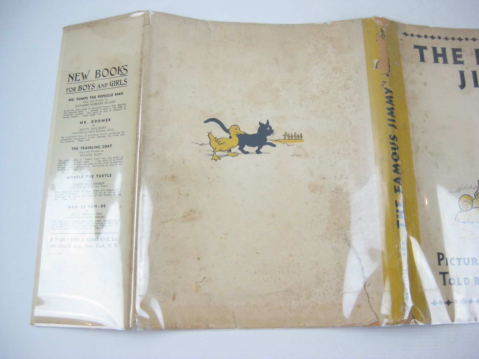 Very good condition in a good dustwrapper. American edition. The story of Jimmy the famous duckling. Large format, white pictorial boards with red cloth spine. Yellow and black illustrations to text throughout.
