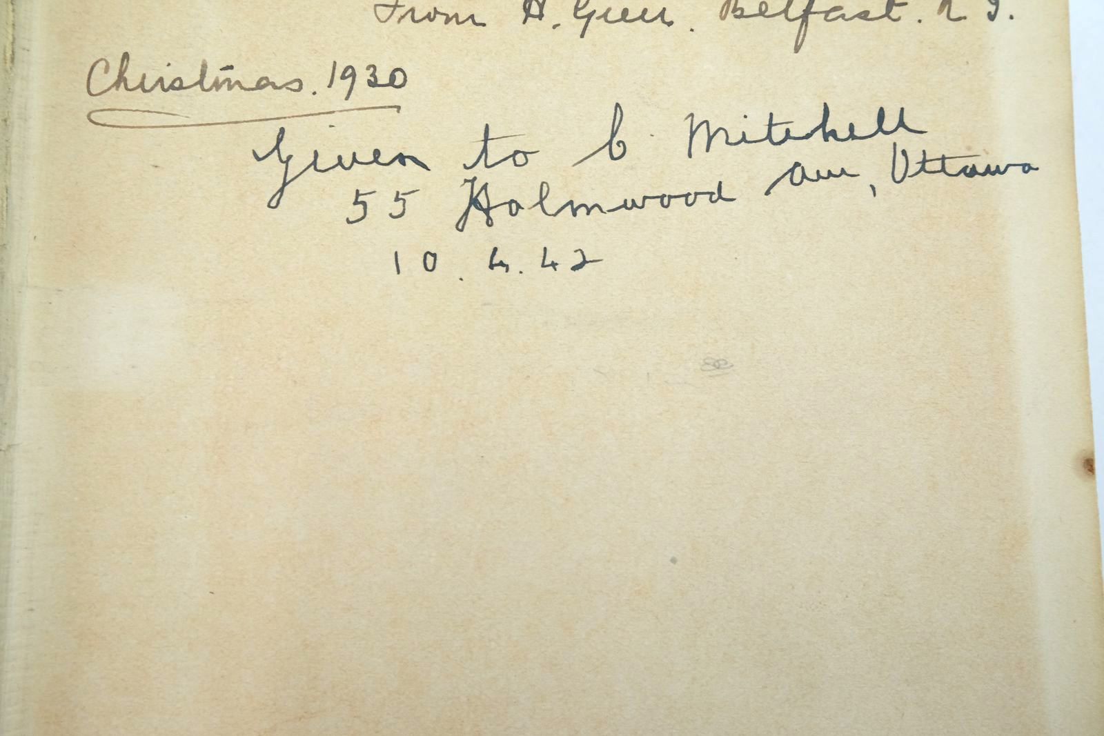 Bumping and wear to spine and corners; a few small nicks to cloth. Cup ring marks to front cover. Joints are a bit cracked and starting to become weak. Inscriptions in ink to front endpaper. Foxing and browning to endpapers, outer page edges and page margins.