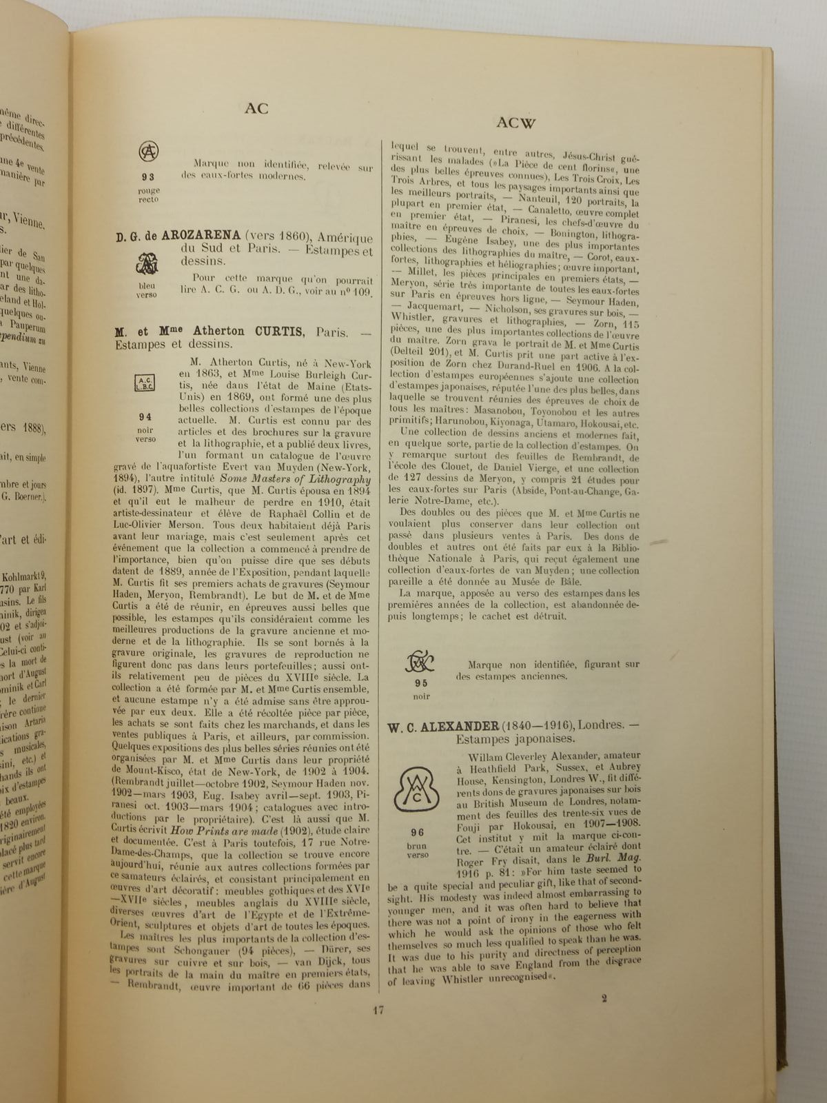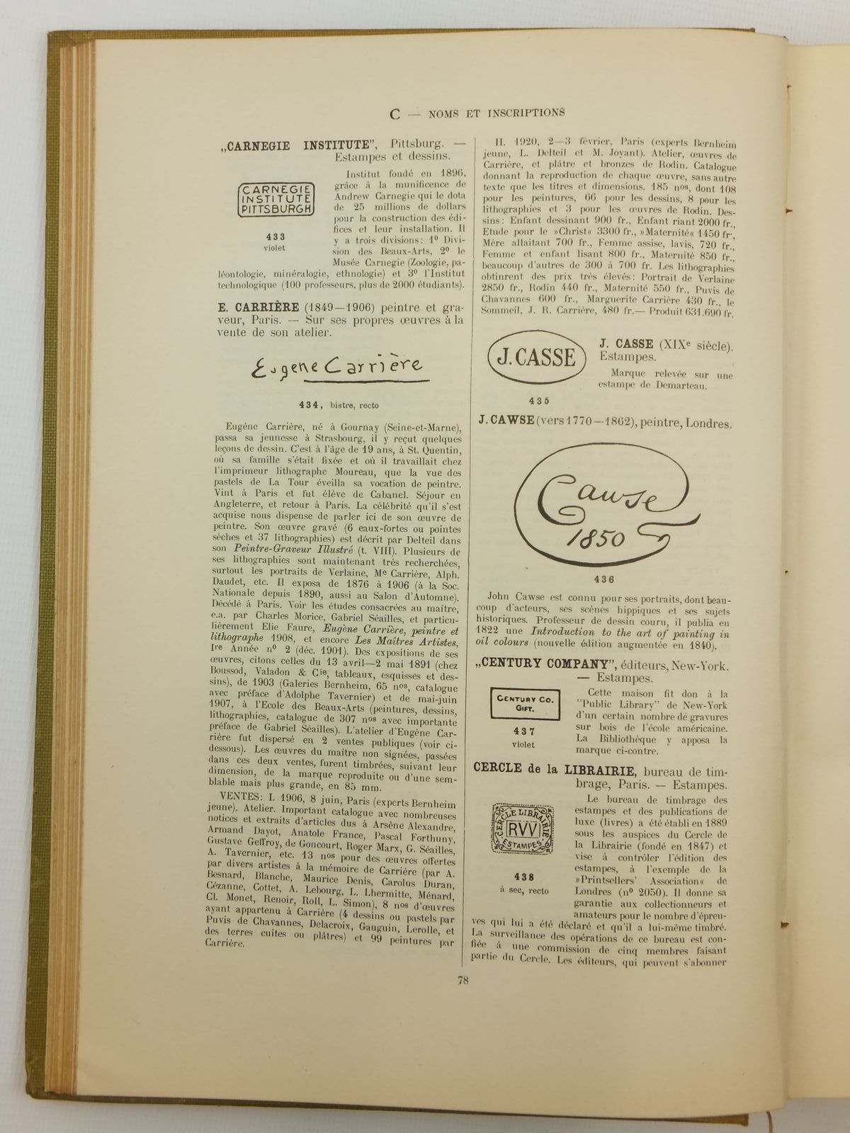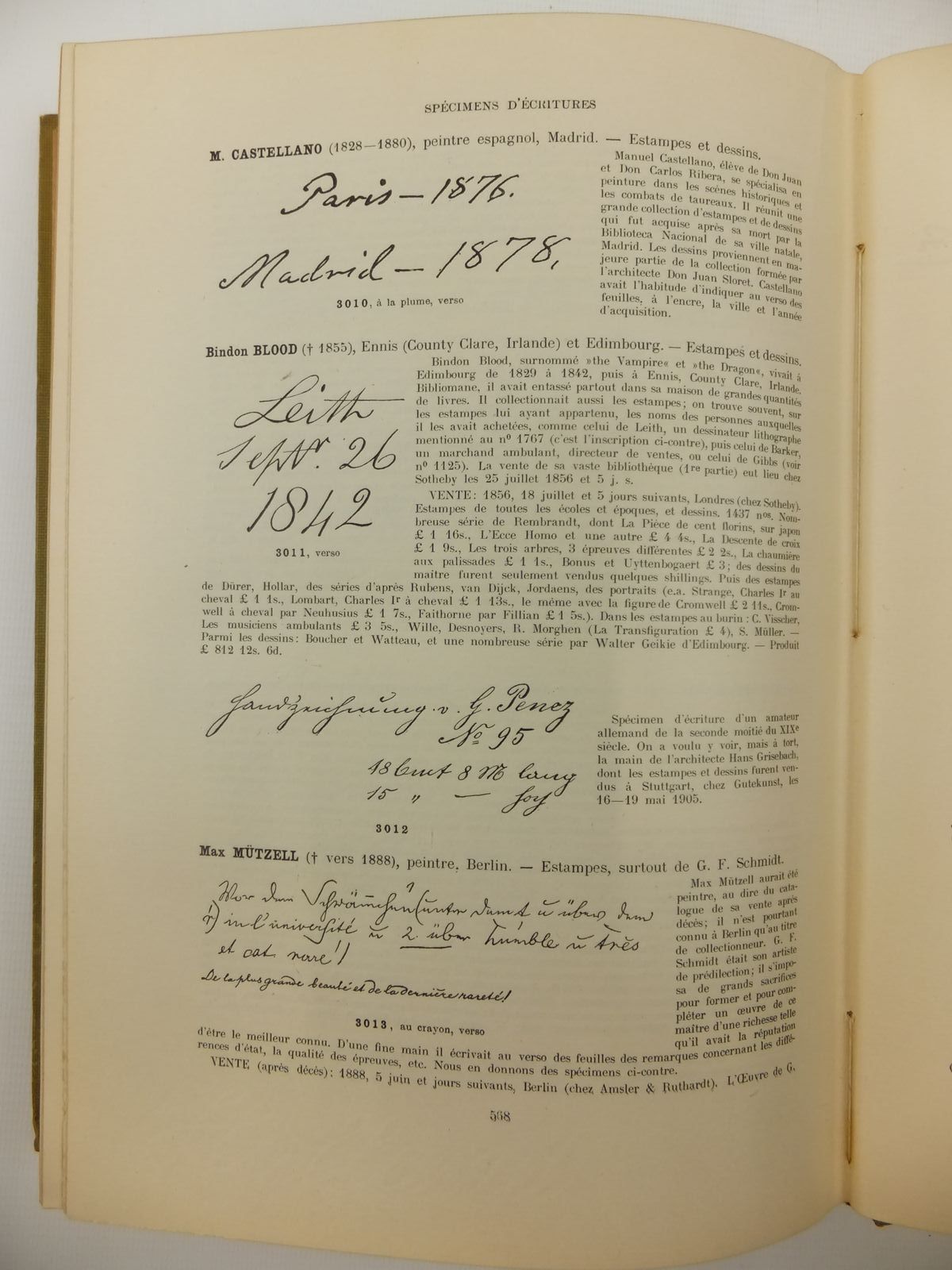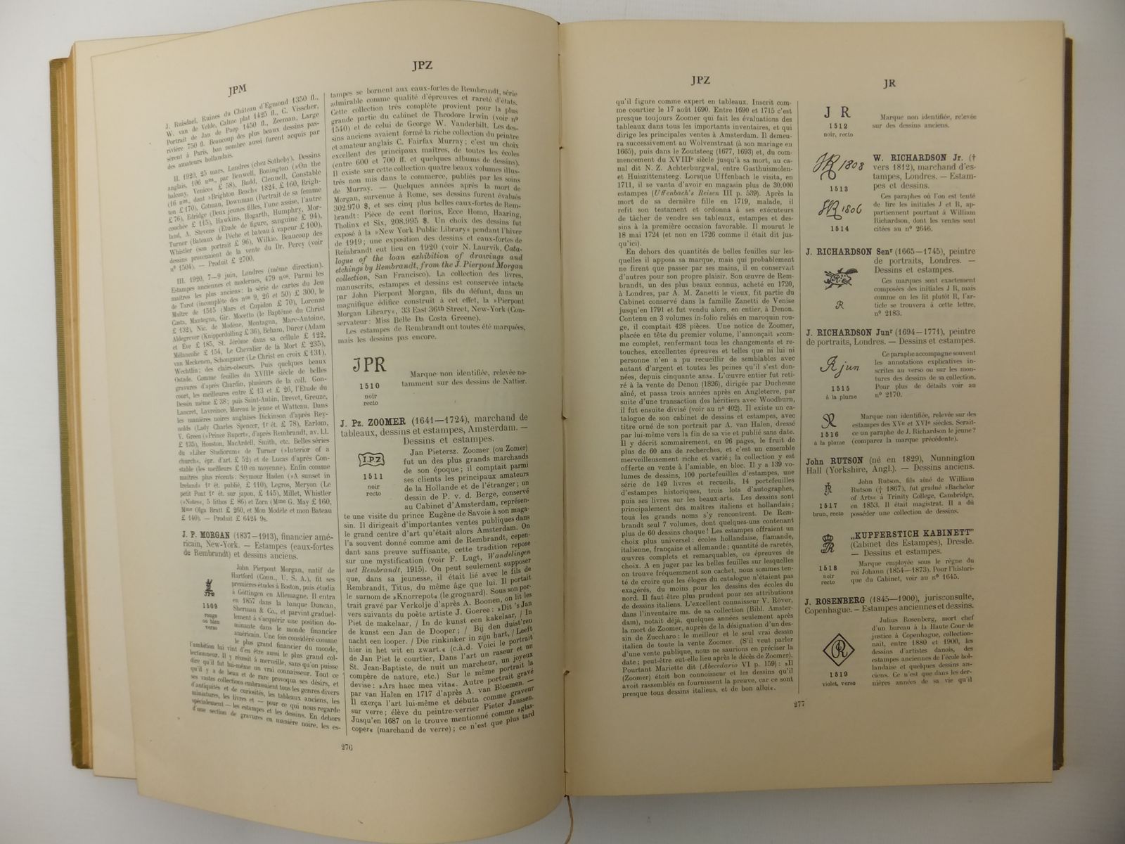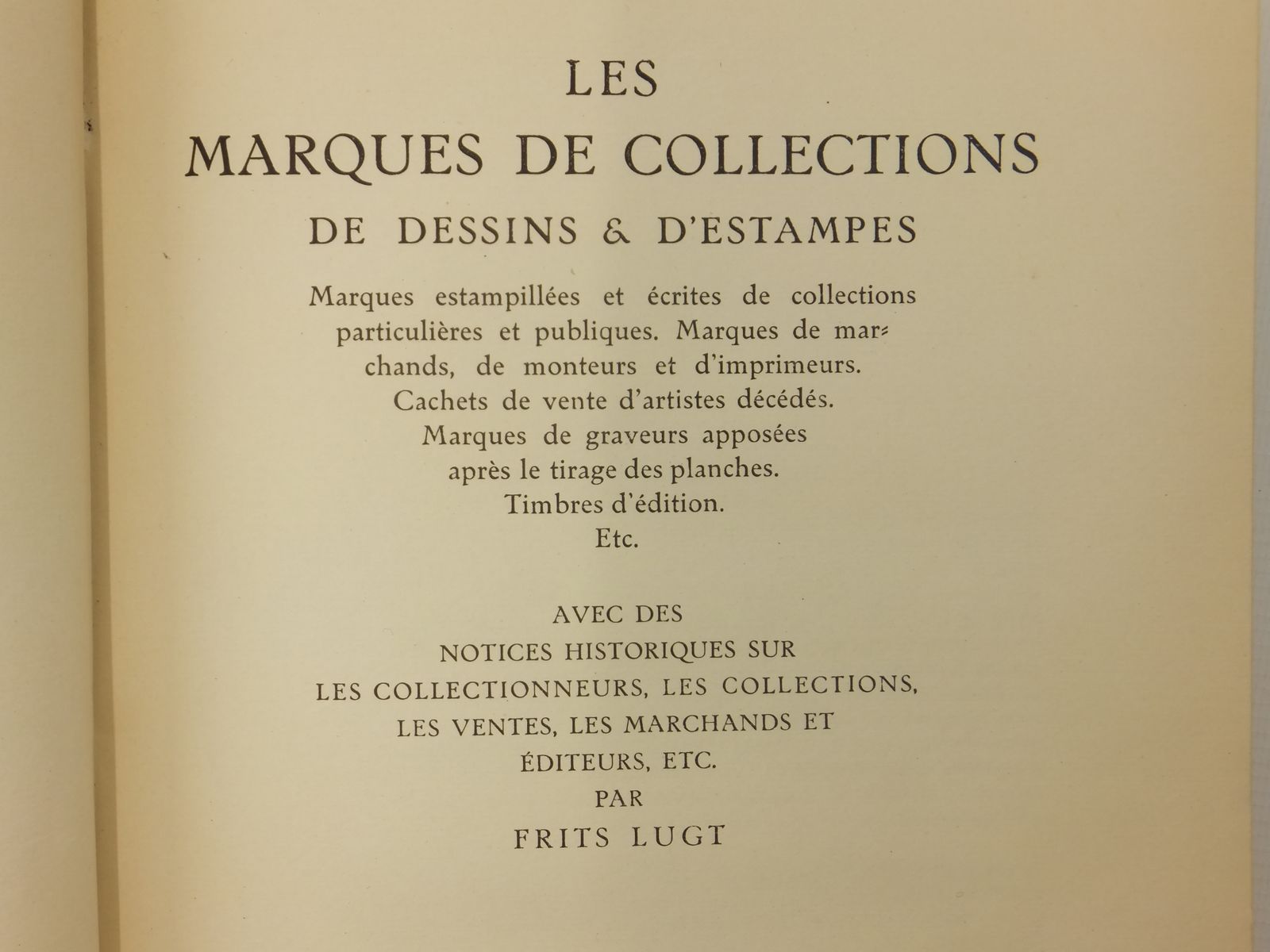 Almost very good condition. Large format. Gilt titles. Text in French. Title: the marks of collections of drawings & prints. Marques estampillees et ecrites de collections particulieres et publiques. Marques de marchands, de monteurs et d'imprimeurs. Chachets de vente d'artistes decedes. Marques de graveurs apposees apres le tirage des planches. Timbres d'edition. etc. (stamped and written marks of private and public collections. Brands of merchants, assemblers and printers. sales channels of decedes artists. Engraver marks affixed after the drawing of the boards. edition stamps. etc.).