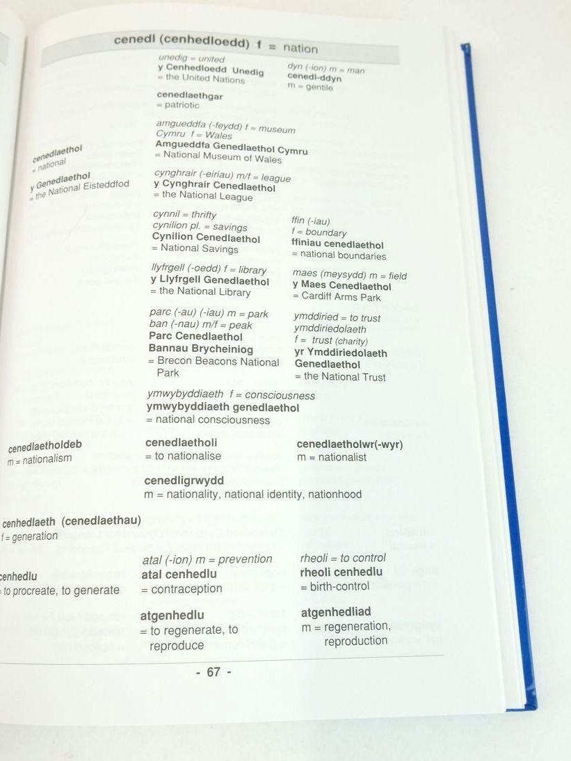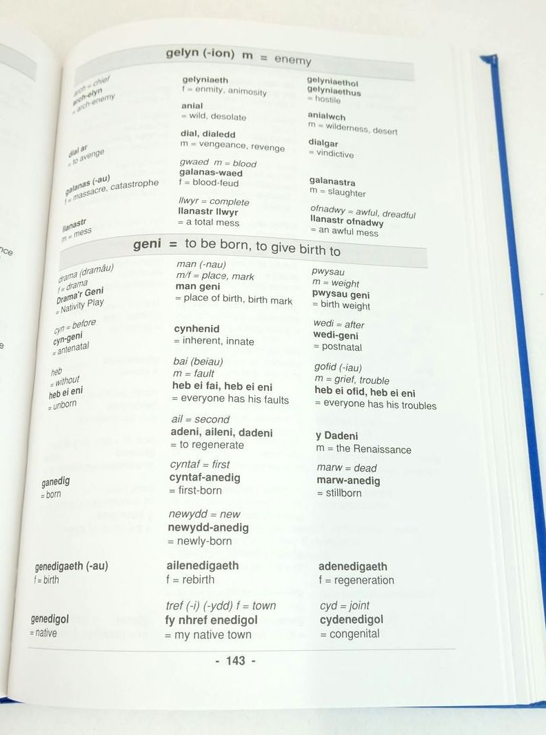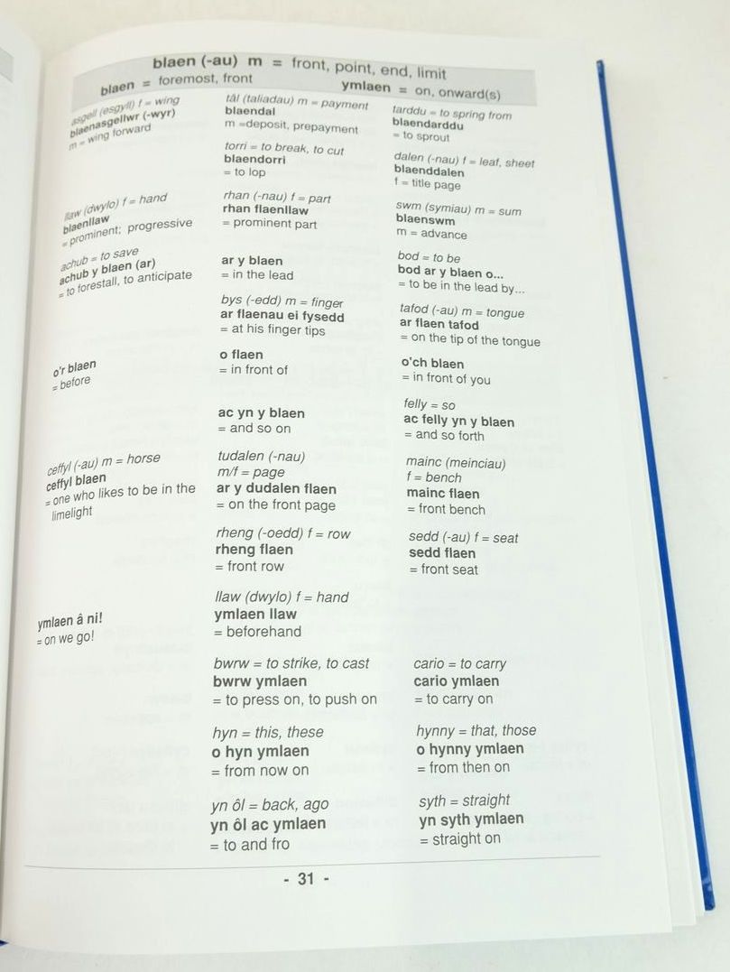 Very good condition. A book for all those who want to accelerate the task of acquiring a vocabulary of modern, contemporary Welsh; for those learning, or seeking to improve their Welsh for reasons of personal interest; for those in the public and private sectors in Wales, who wish to use Welsh at work. An innovative approach to the problem of acquiring an easily assimilated vocabulary - namely through the ROOT structure of the language. Blue glazed boards.