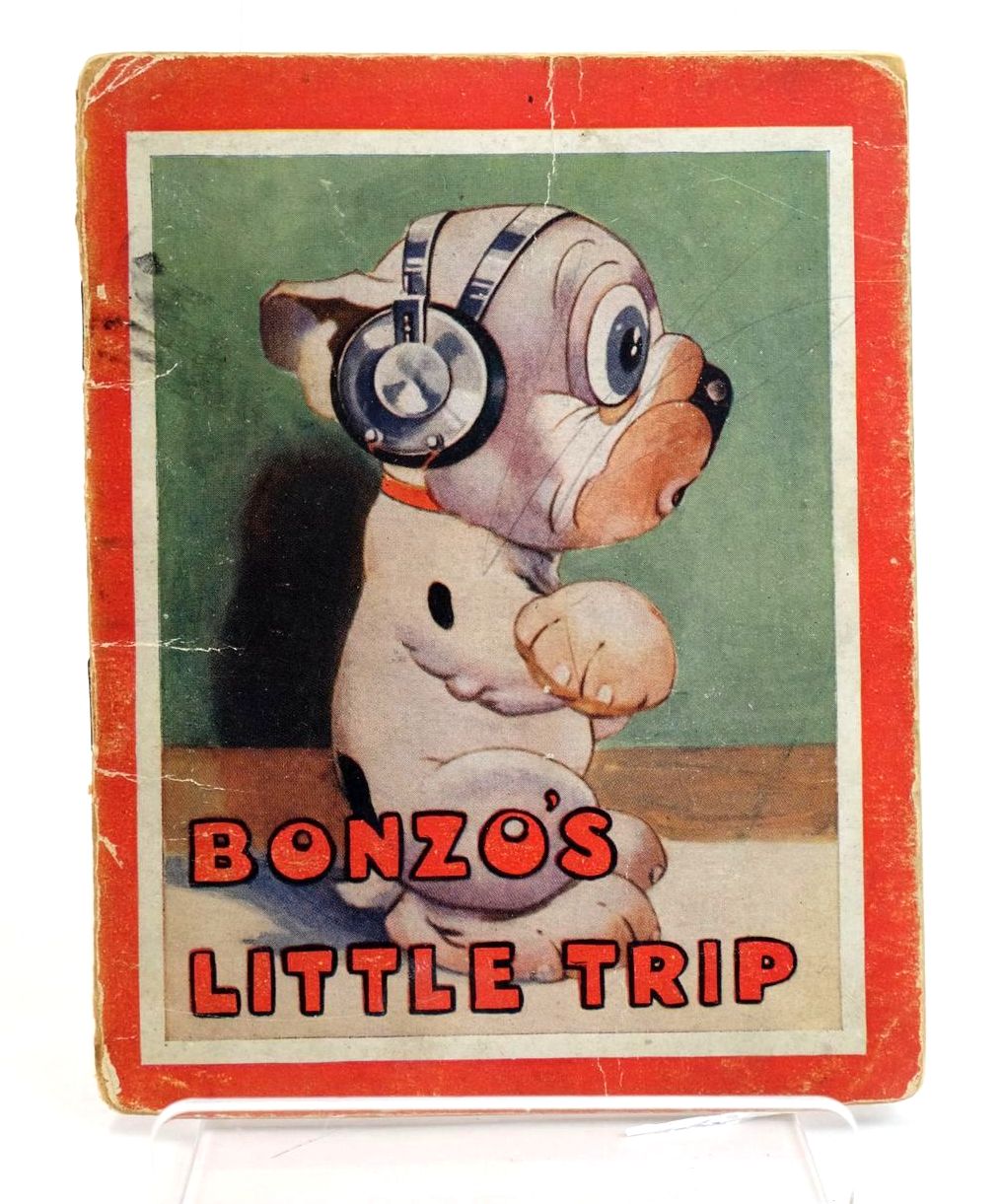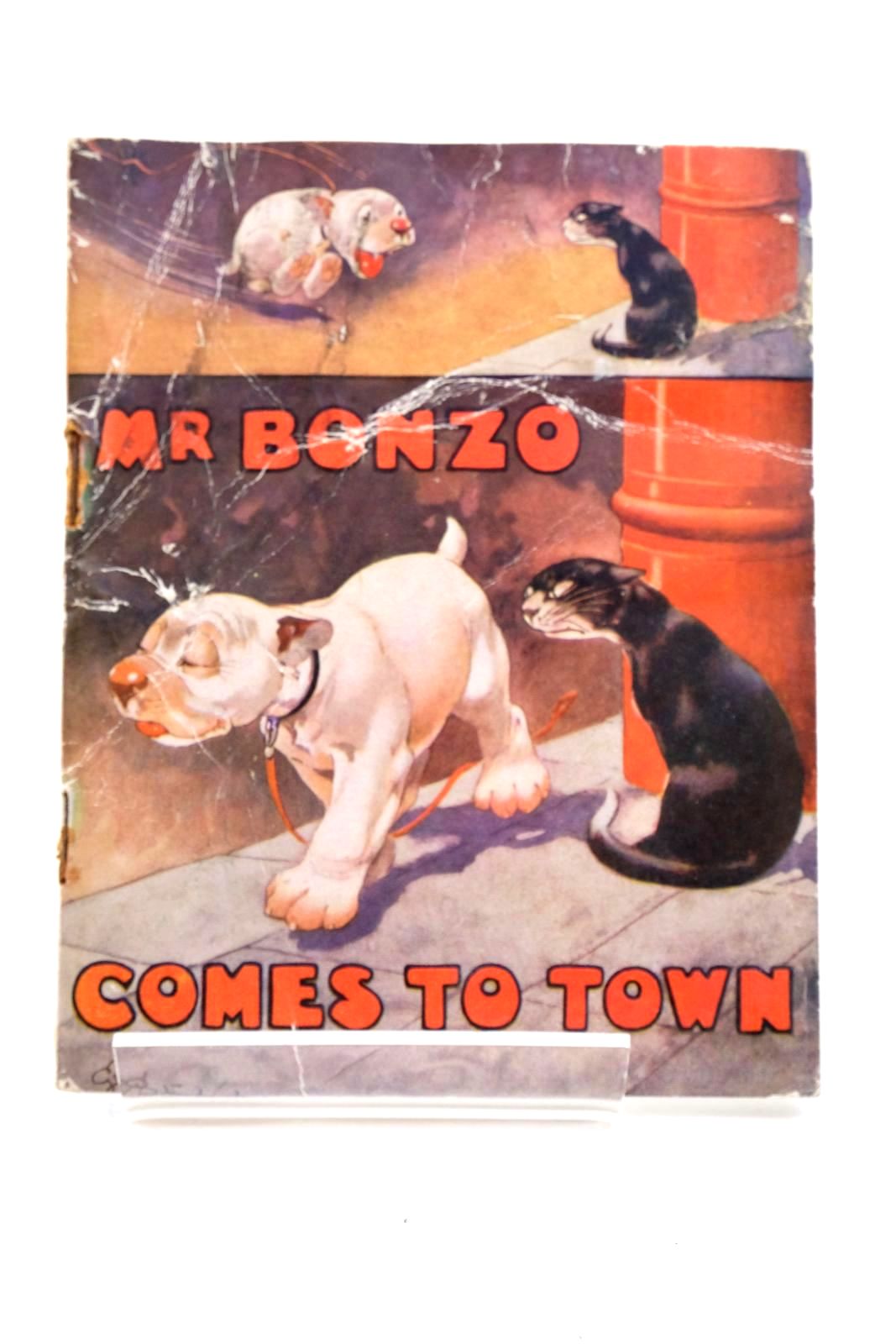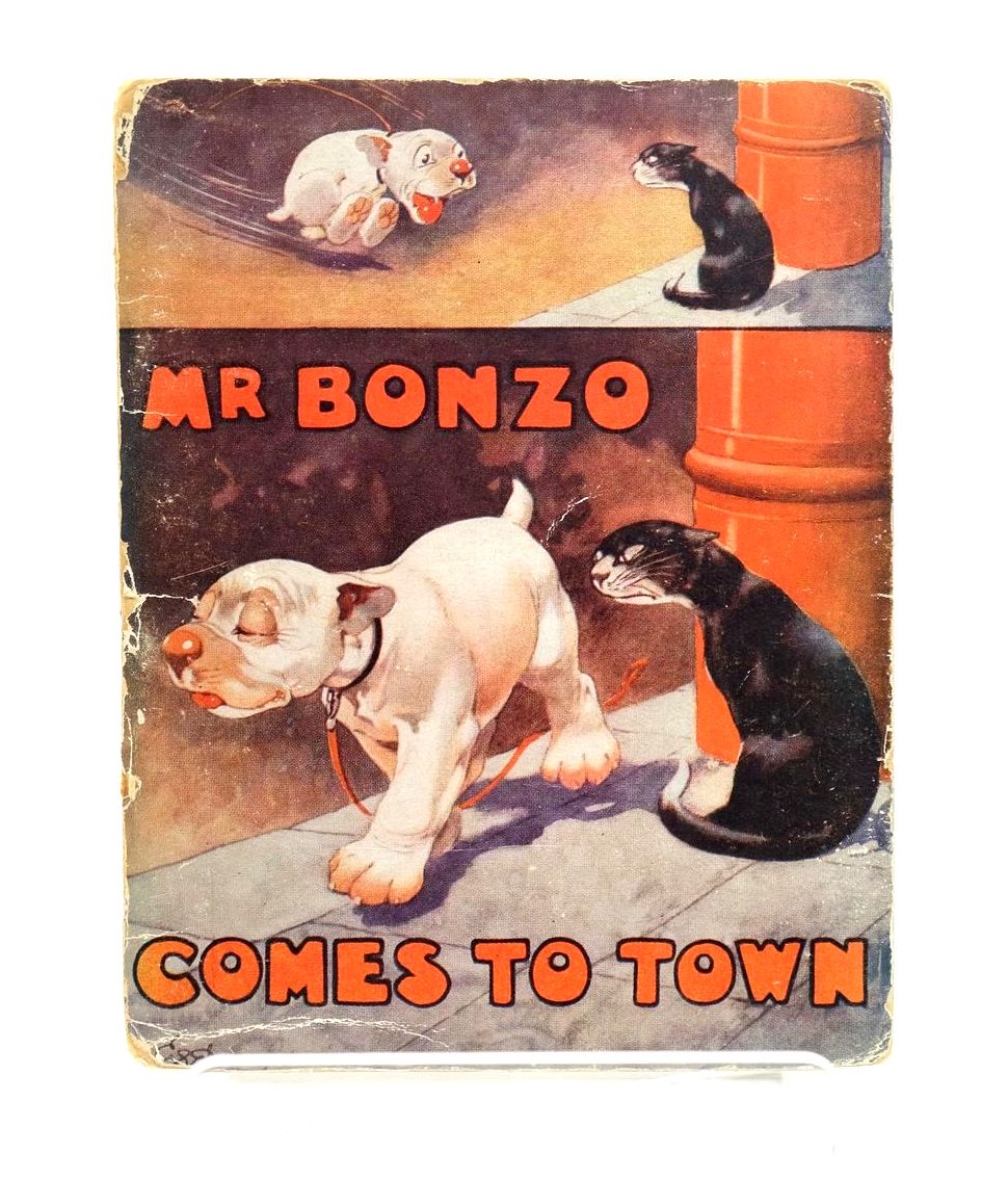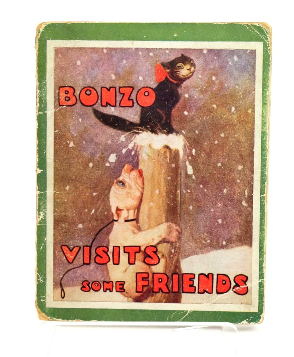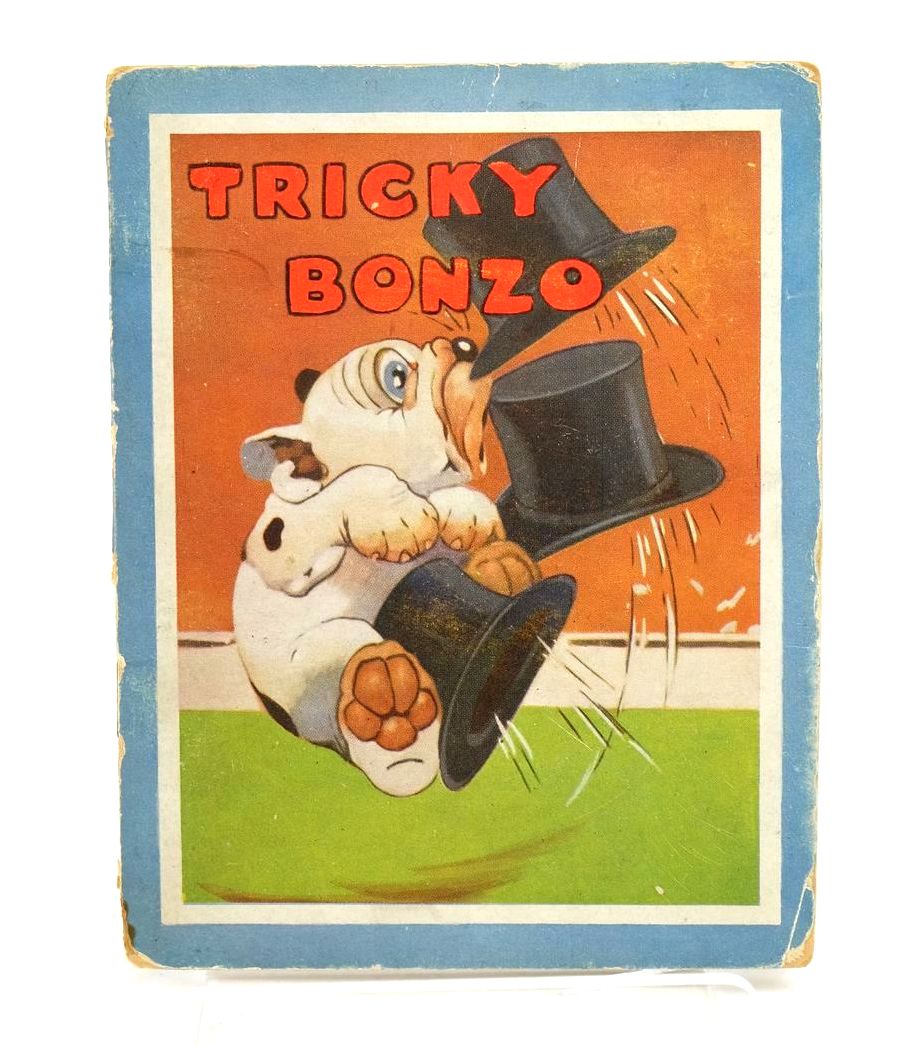 Red cloth spine. Front cover shows Bonzo as a clown with a black cat reading to him. First story is 'Bonzo's Queer Zoo'. B/w illustrations. Colour frontis is 'All The Fun of the Fair'. Covers are edge worn and a little scratched and marked. Spine worn with splits at top and tail. Ink name and address stamps to belongs to page and name and address in ink to belongs to box (also ink stamps which has been partially erased). Some hinges cracked/pulled. Small tear at inner margin of frontis. A good copy of a scarce Bonzo annual.