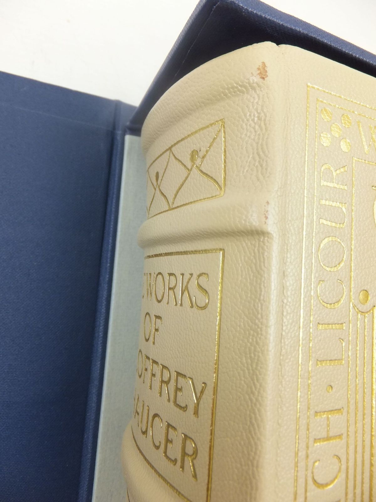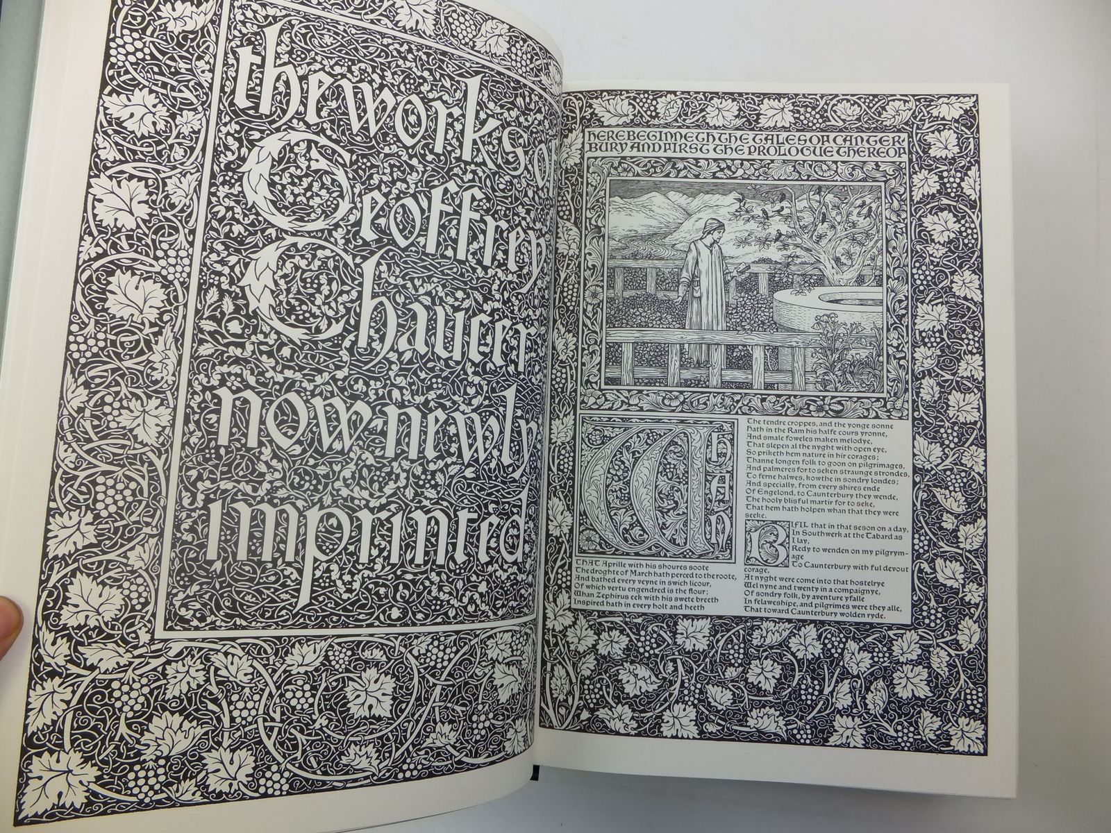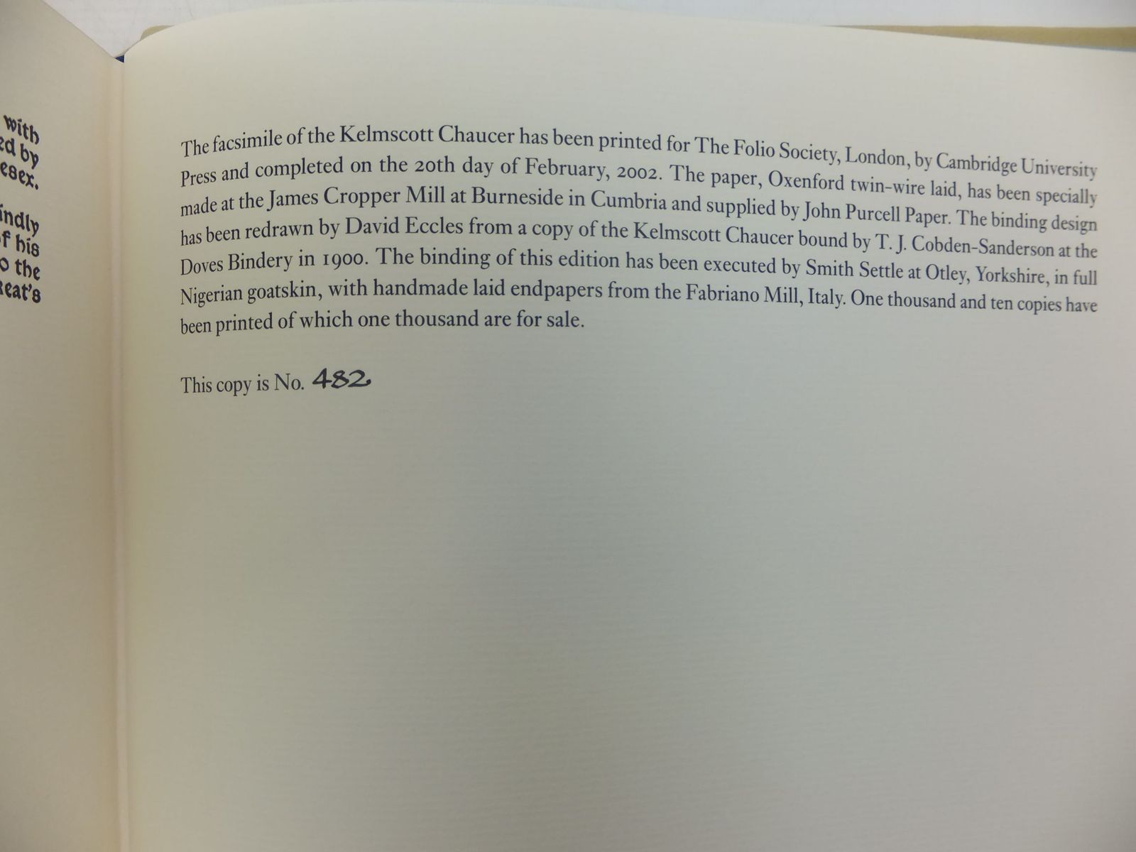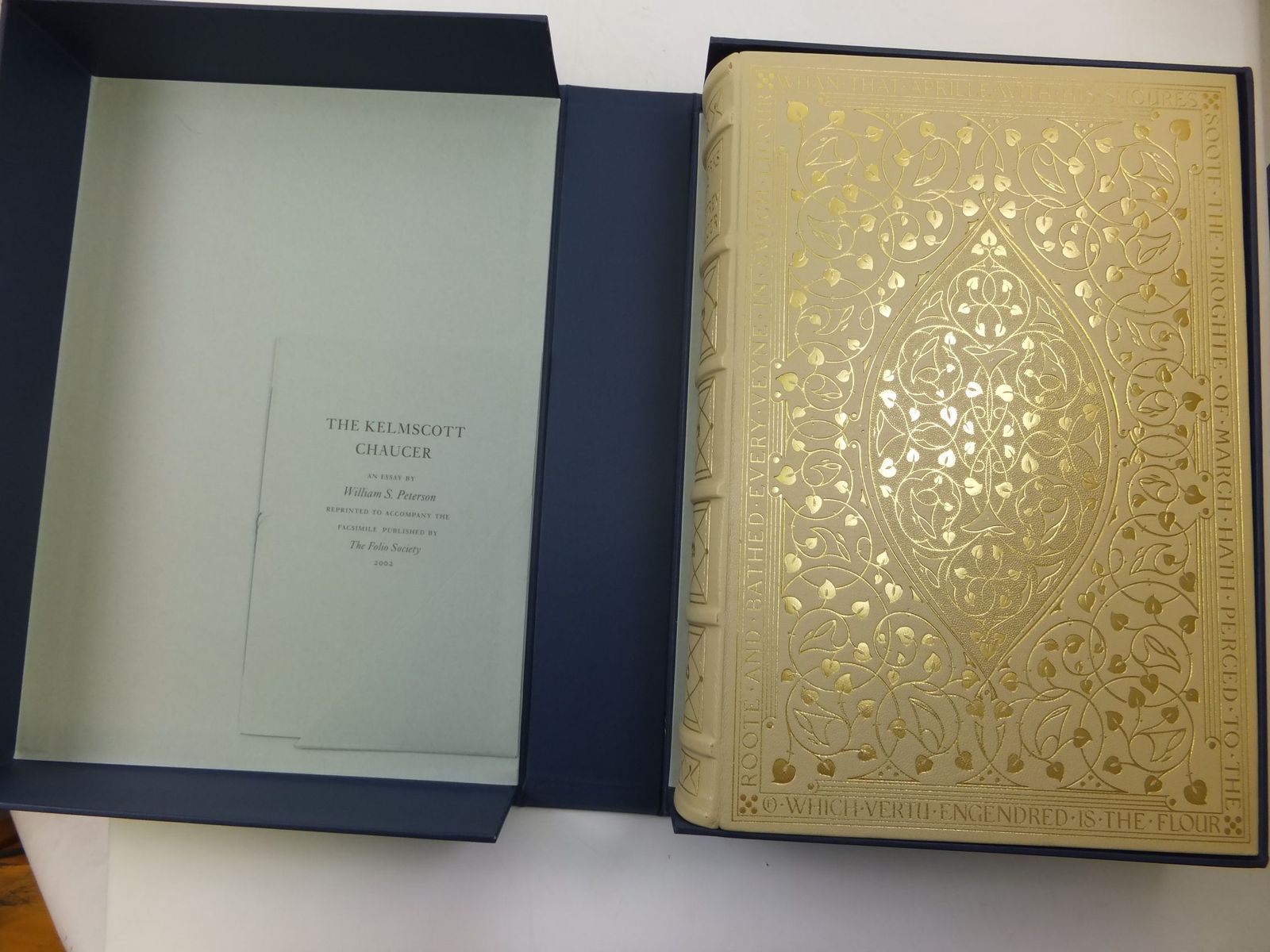 Fine condition. Now newly imprinted. A fine facsimile edition of the Kelmscott Chaucer. Large format. Heavy volume. Elaborately gilt decorated cream Nigerian goatskin by Smith Settle, Otley, to a design by David Eccles after T.J. Cobden-Sanderson's (original binding bound at the Doves Bindery for the Kelmscott Press in 1900), together with a loosely inserted slip with advice about storage and handling, plus An Essay by William S. Peterson Reprinted to Accompany the Facsimile Published by The Folio Society, 16 page booklet in paper wraps, contained together in original blue buckram solander box, with gilt lettered morocco spine label. Limited edition to 1010 copies. Due to the size of this book, if posted, it will need to be sent via courier and may incur extra shipping costs.