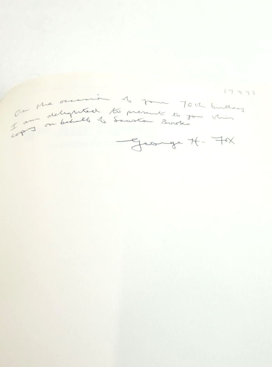 SIGNED with gift dedication to free front endpaper. Contents are low down in the boards and 0.5cm forward from spine (binding error not affecting book itself). Contents clean. Blue pictorial dustwrapper is lightly edge-creased, old price-label to front flap.