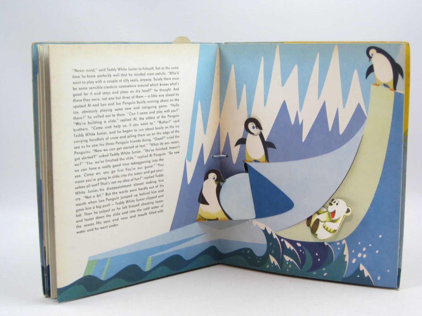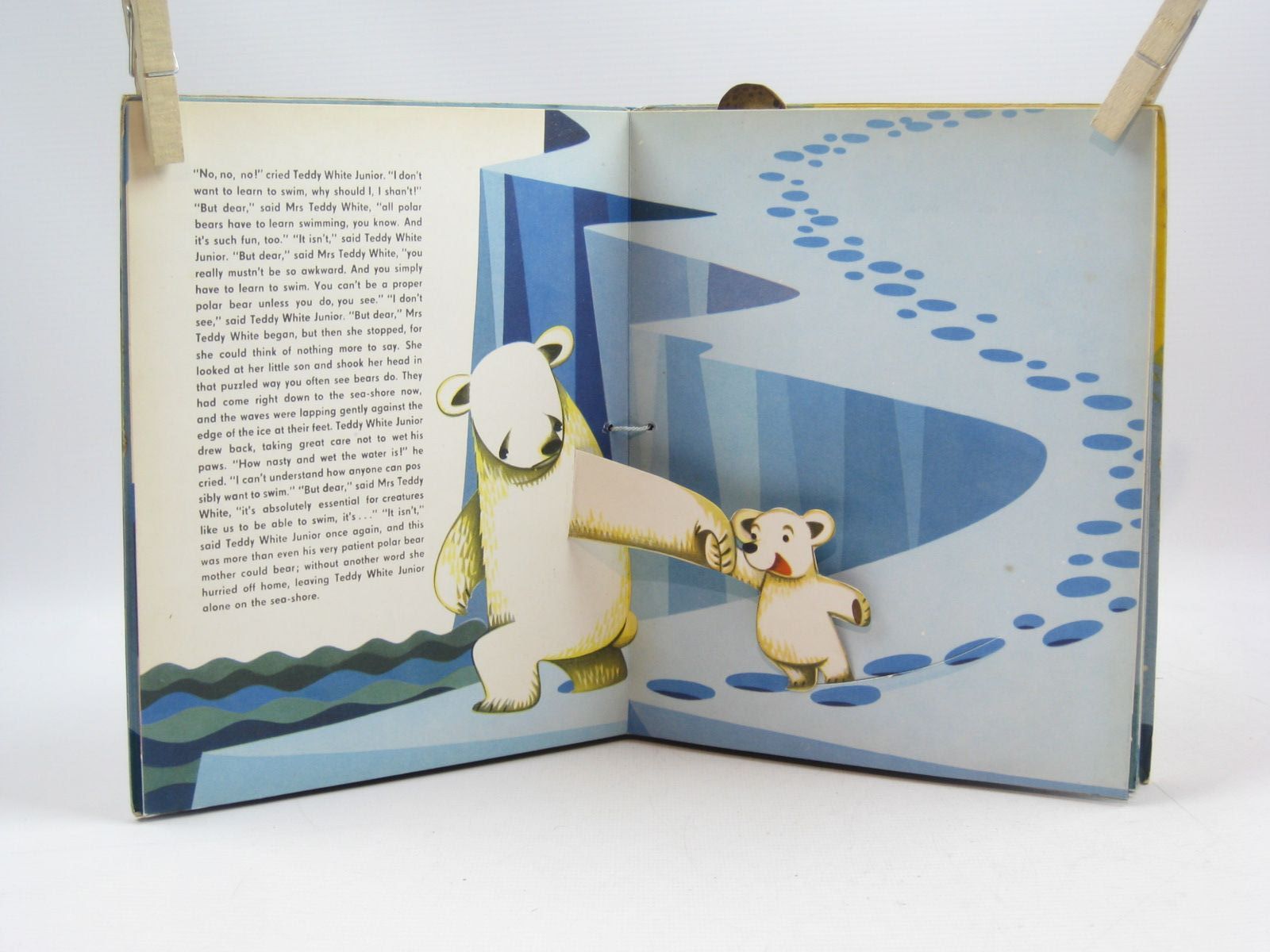 Very good condition. "Who didn't want to learn to swim". Blue cloth spine, pictorial card covers. Text plus movable parts to each double page spread, 6 in total.