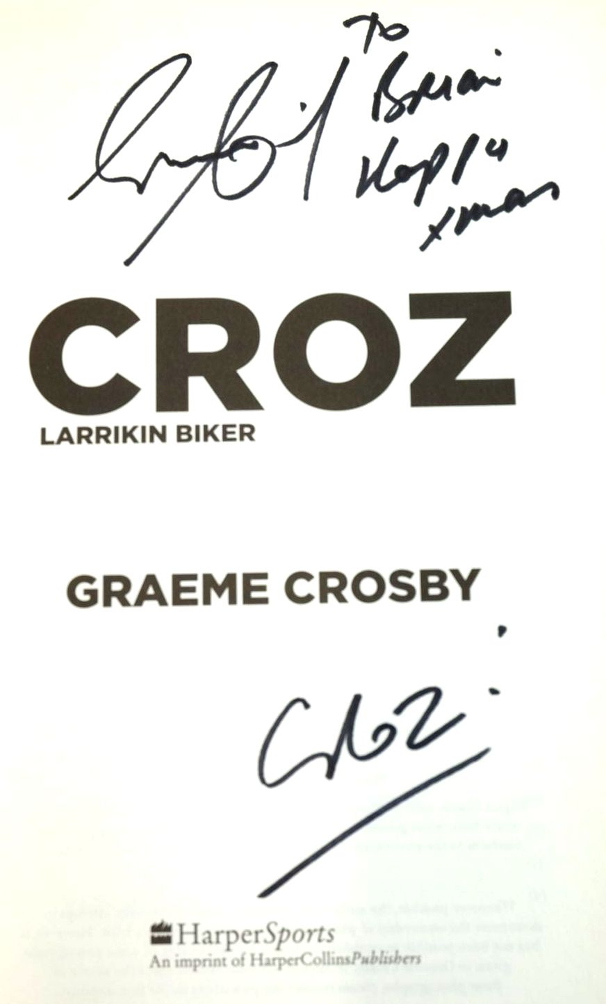 Slightly better than very good condition. In 1979 Graeme Crosby arrived in Britain with his worldly possessions in a carry-bag. Four years later 'Croz' as he is affectionately known to millions of fans, walked away from the glamour world of world championship Grand Prix racing, taking with him a bag full of trophies and his ever-present sense of humour... Pictorial cardwraps. Colour & b/w photos.
