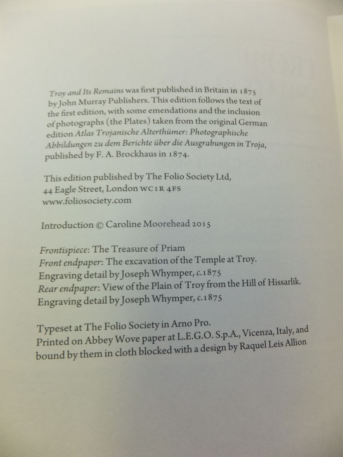 Fine condition. A Narrative of Researches and Discoveries Made on the Site of Ilium and in the Trojan Plain. Introduced by Caroline Moorehead. Orange cloth boards with blocked design to front board, black title to spine. B/w illustrations.