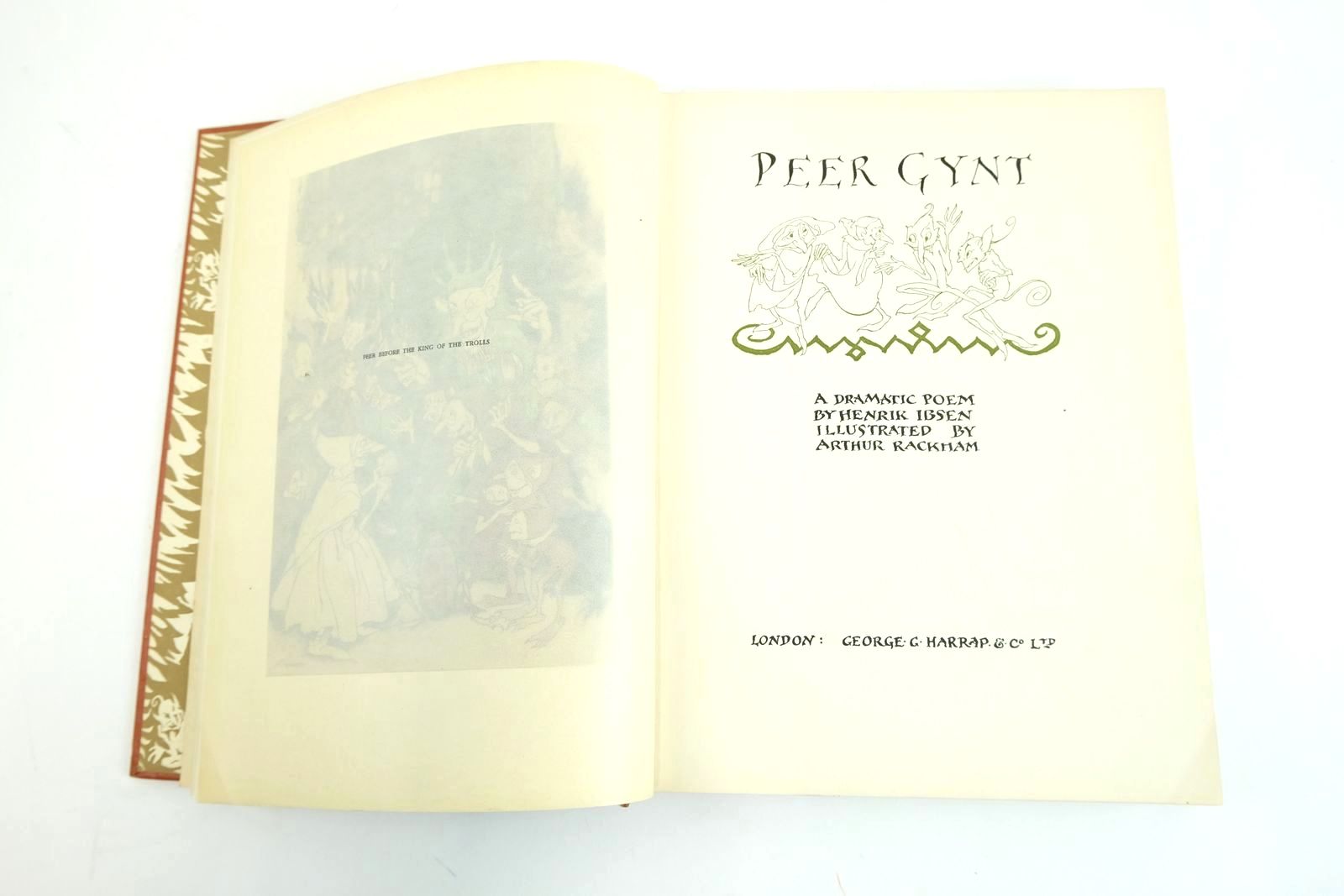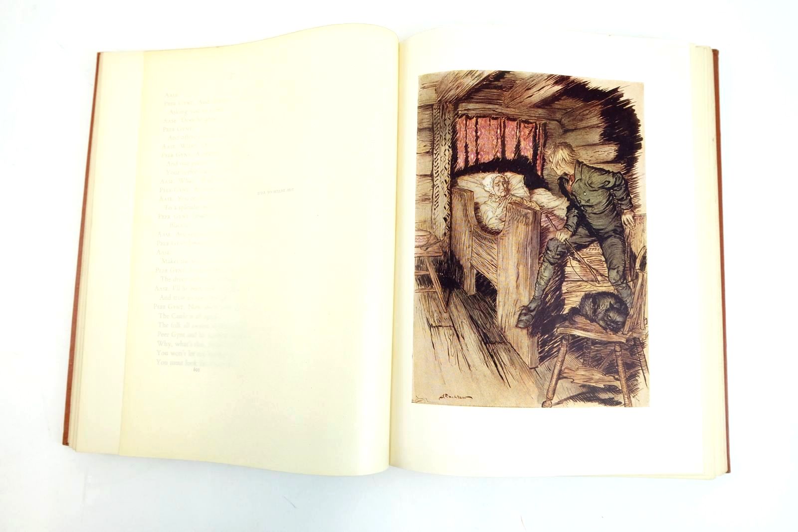 Very good condition. Peer Gynt is first and foremost a poetic fantasy, although based on a real person who lived Norway c1800. About his exploits, not much more is known than is found in Asbjornsen's book Norwegian Fairy Tales, in which Peer Gynt's chief exploits lie in the direction of fighting and conqueroring trolls. Admirably depicted by the "Goblin Master" in 12 colour plates plus b/w text illustrations. Brown cloth, gilt titles and vignette to front cover. Cream and brown pictorial endpapers. 255 pages.