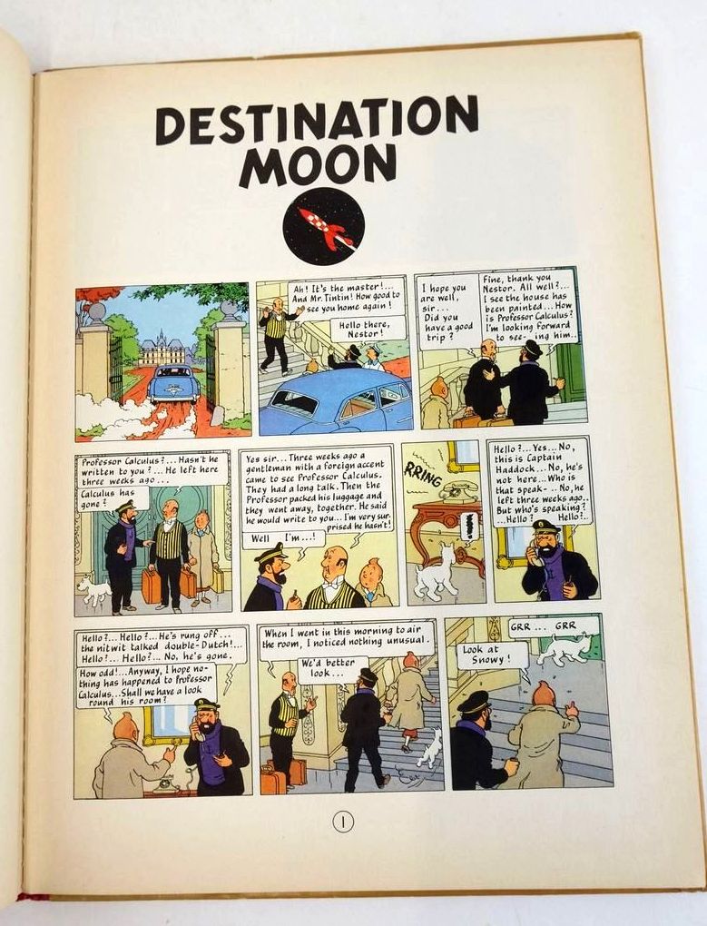 Very good condition. Young reporter Tintin and his friend Captain Haddock receive an invitation from Professor Calculus to come to Syldavia, where Calculus is working on a top-secret project in a secure government facility to plan a crewed mission to the Moon. Large format. Red cloth spine, blue pictorial boards. Colour cartooon strip illustrations. 61 pages.