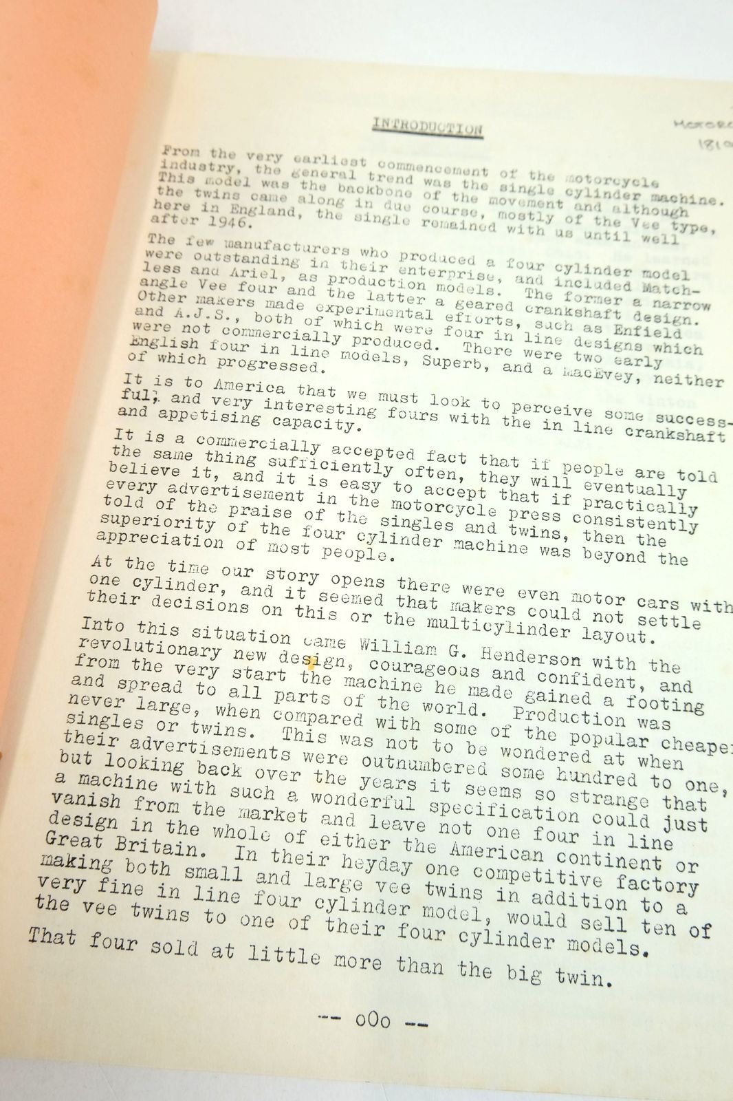 Very good condition. Henderson manufacturer of 4-cylinder motorcycles from 1912-1931, largest and fastest machines of their time. Peach paperwraps. Stapled binding. 45 pages. Type script.
