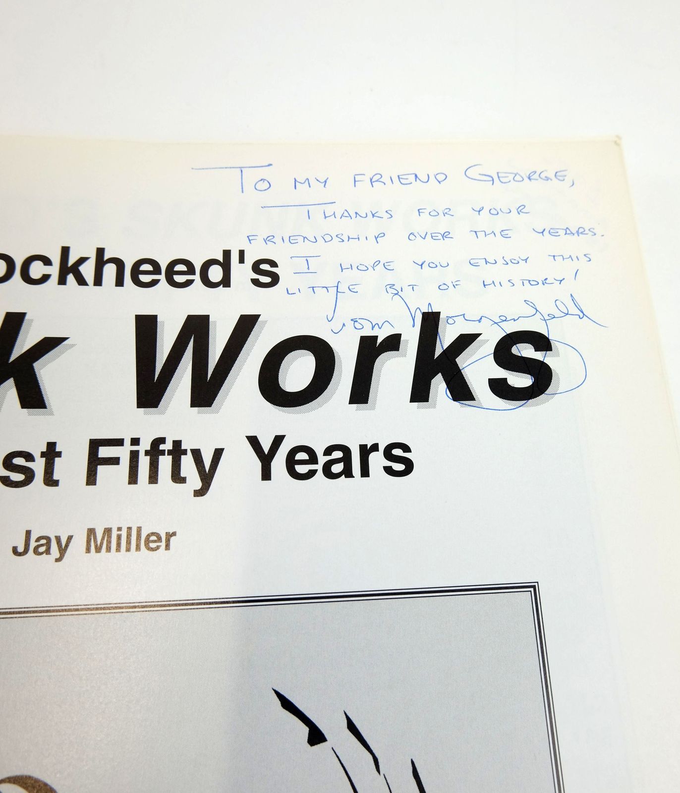 Signed (with personal dedication) by the chief test pilot for Lockheed Skunk Works, Tom Morganfeld. Card covers a little grubby and rubbed at corners.