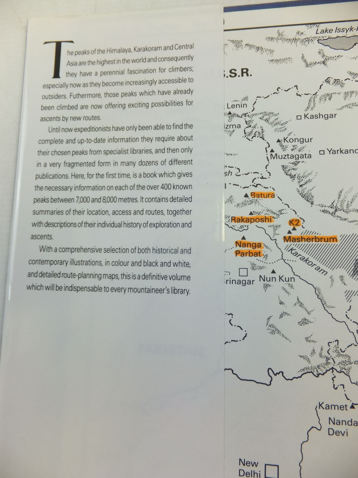 Slightly better than very good condition in a slightly better than very good dustwrapper. Information on each of the over 400 known peaks between 7,000 and 8,000 metres, containing detailed summaries of their location, access and routes, together with descriptions of their individual history of exploration and ascents. Blue boards, gilt title to spine. B/w and colour photos. Endpapers depict the ranges of Central Asia.