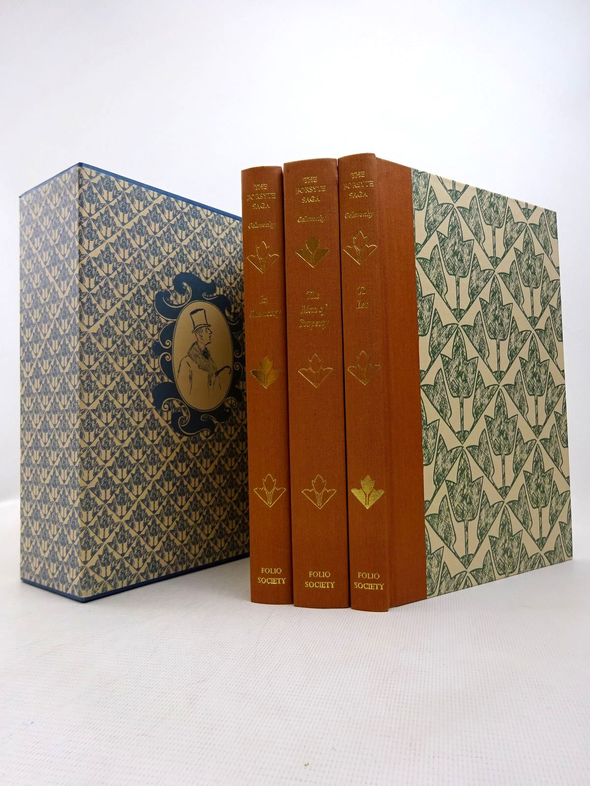 Fine condition. Three volumes; The Man of Property; In Chancery; To Let. Peach coloured cloth spines with gilt titles and vignettes. Blocked pattern to paper sides. Pictorial endpapers. B/w illustrations.
