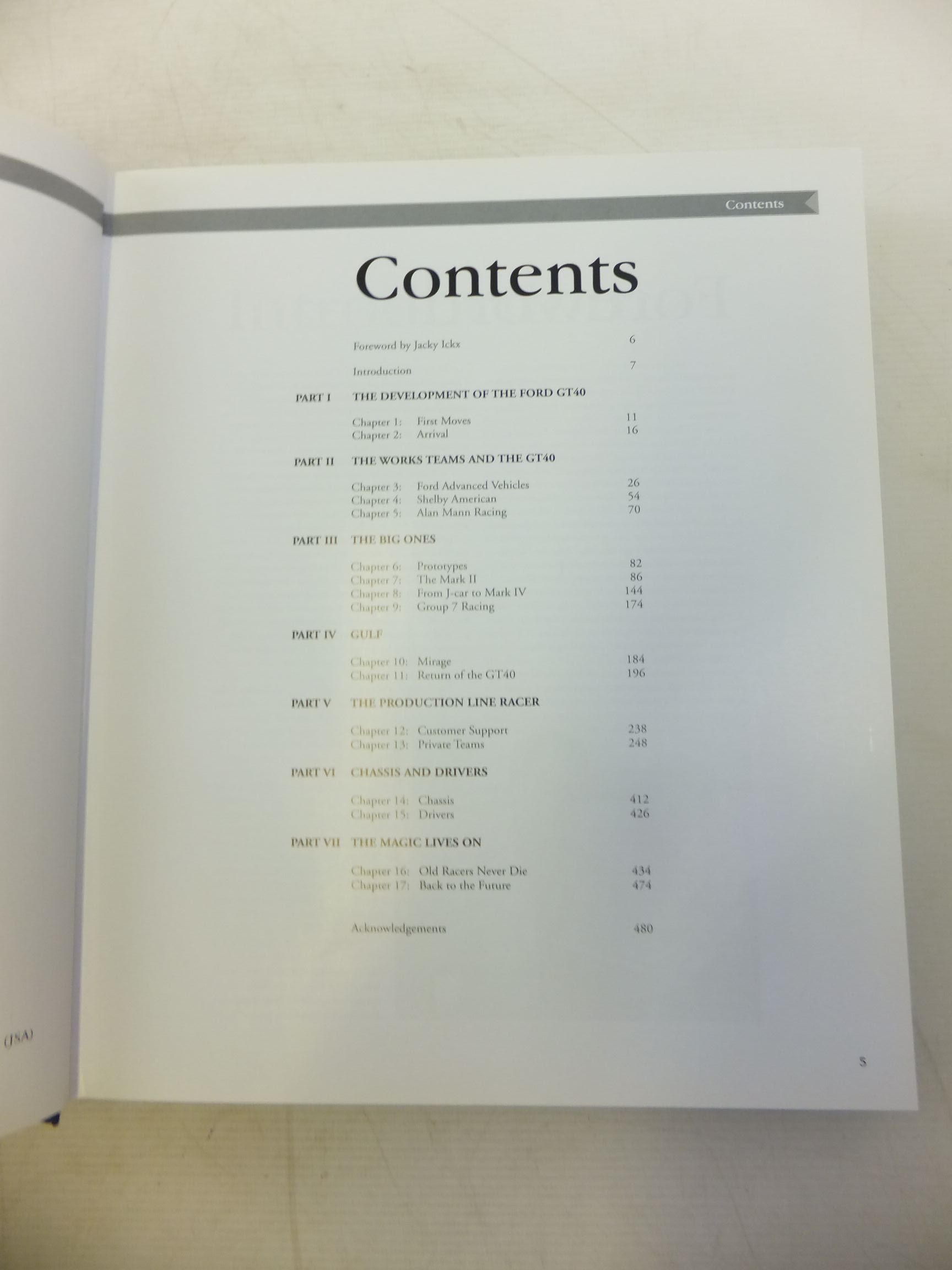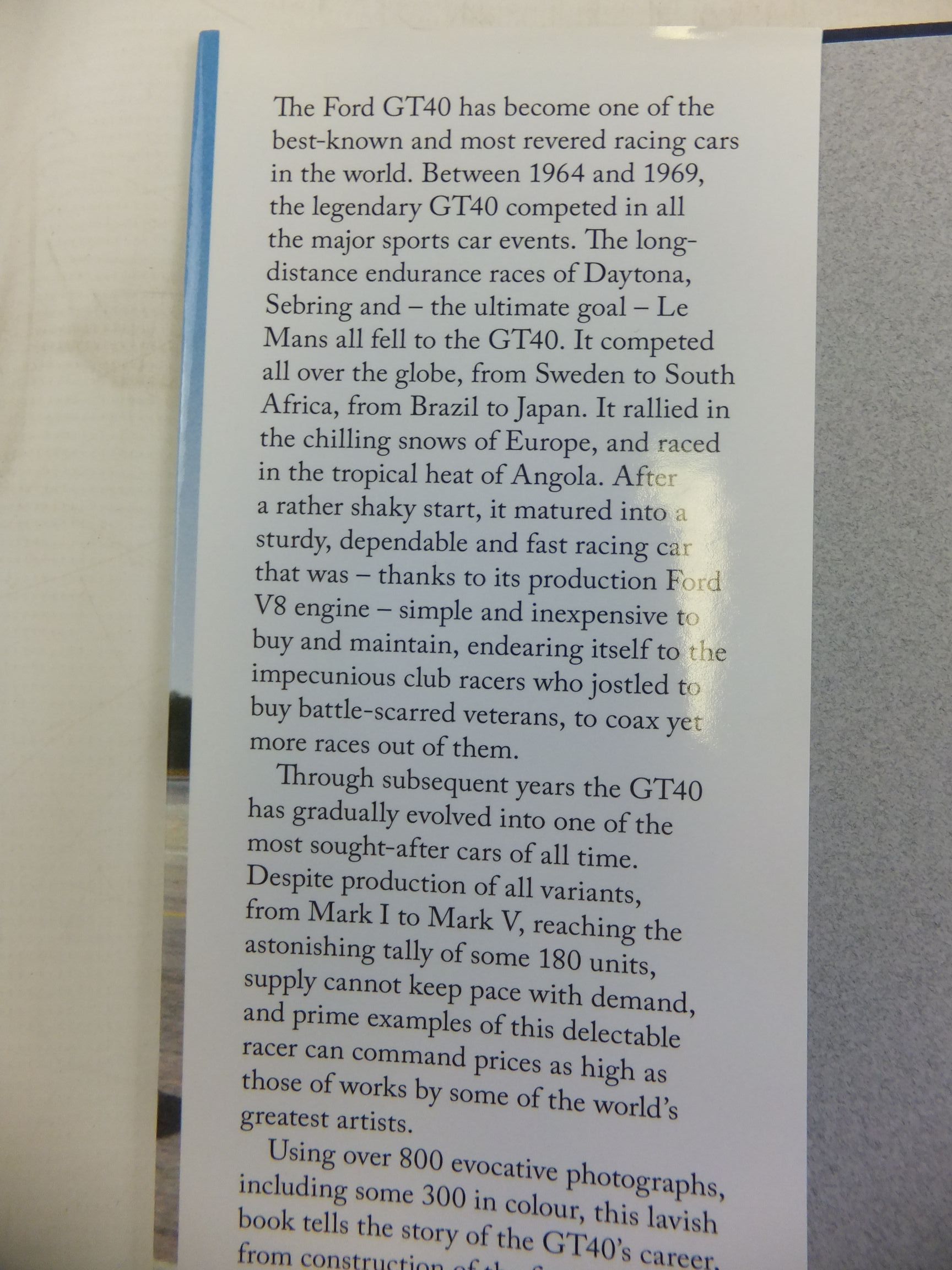 Fine condition in a fine dustwrapper. Large format. Colour and b/w photos. The GT40, placed 1-2-3 at Le Mans in 1966 and won the next three consecutive years.