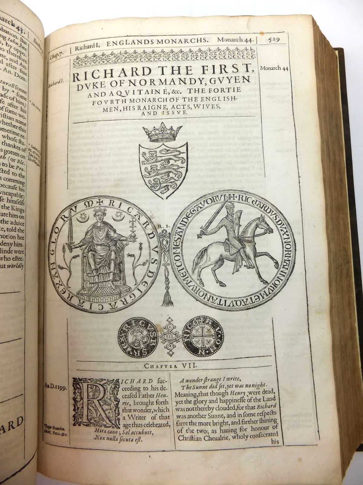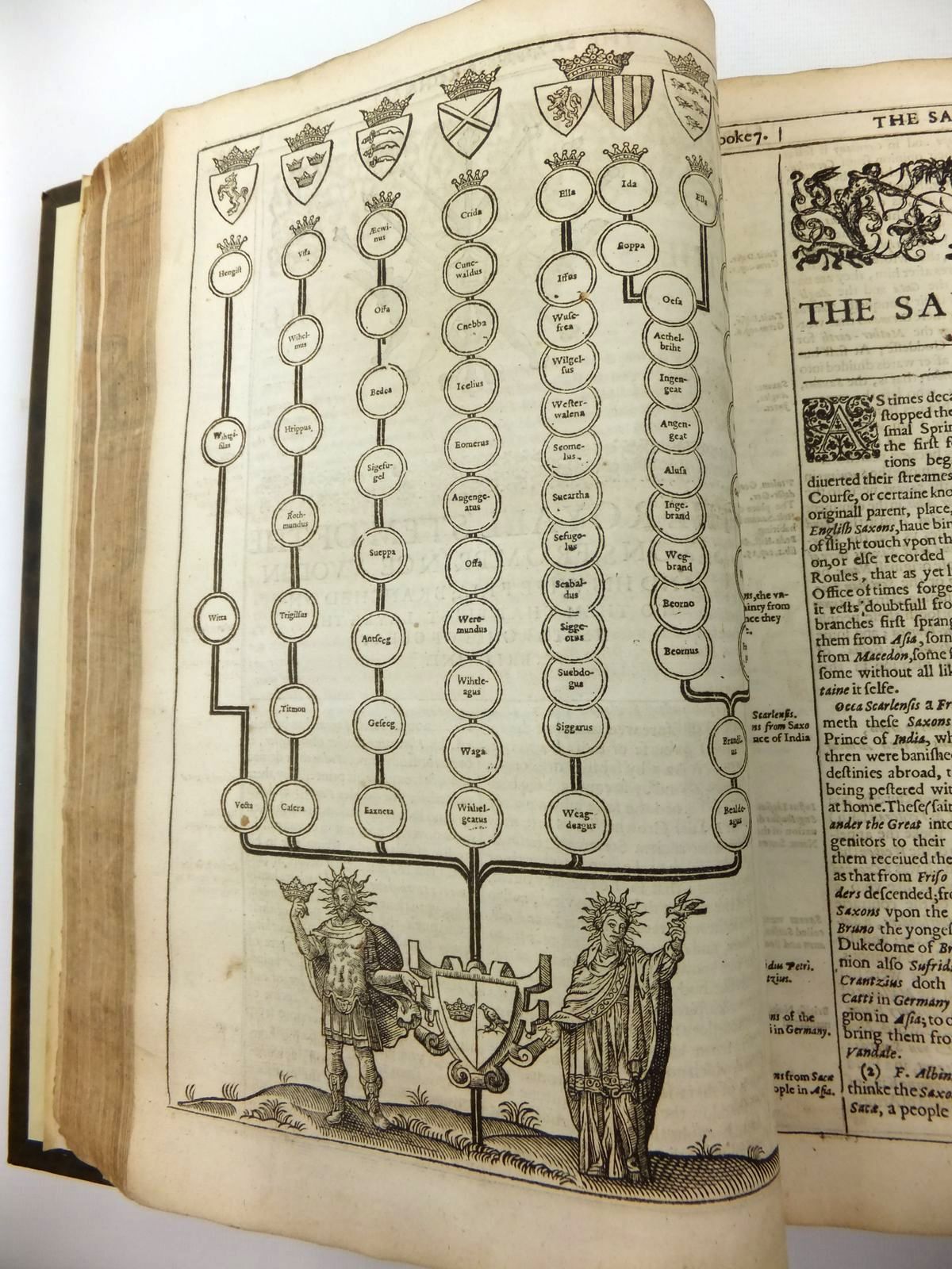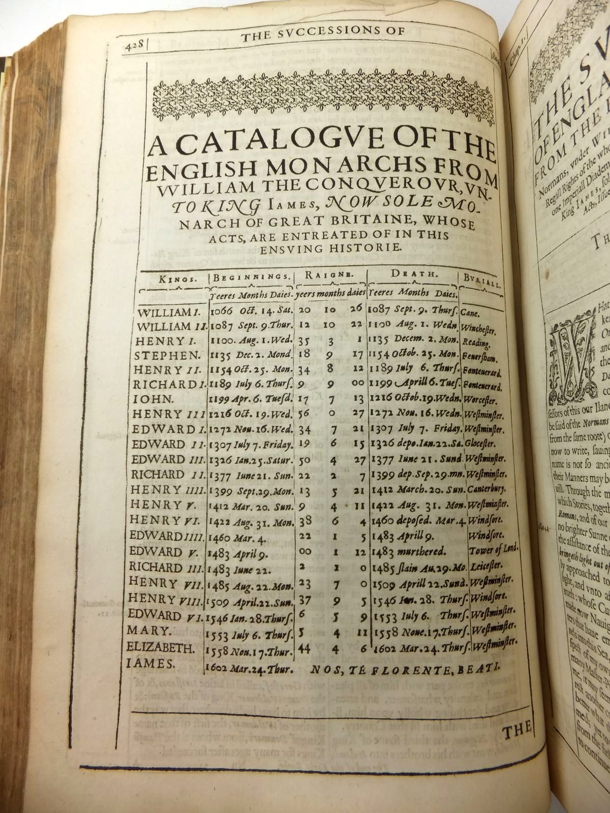 Very good condition. Their Originals, Manners, Habits, Warres, Coines and Seales: with the Successions, lives, acts etc. of the English Monarchs. Second Edition. Revised and enlarged. Contents lists 10 books; this binding contains the following: Contents, plus 8 page proeme; Books 5 - 10, plus Summary of the whole and 78 page index table. Very large format. Leather binding with raised bands to spine and black title labels and gilt titles. Contains woodcuts.