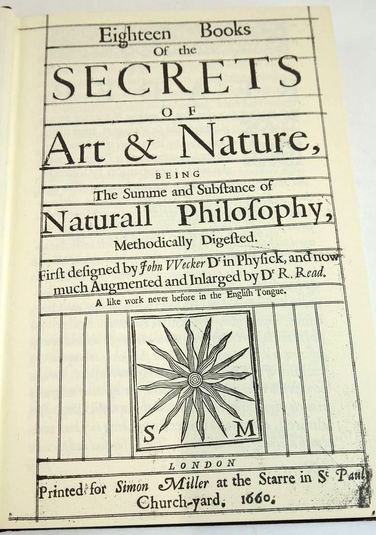 Slightly better than very good condition. Facsimile of the 1660 edition. Undated. Brown cloth boards, gilt title to spine reads 'Secrets of Art and Science'. Facsimile title page reads: 'Eighteen Books of the Secrets of Art & Nature, being The Summe and Sbstance of Naturall Philofophy, Methodically Digefted'.