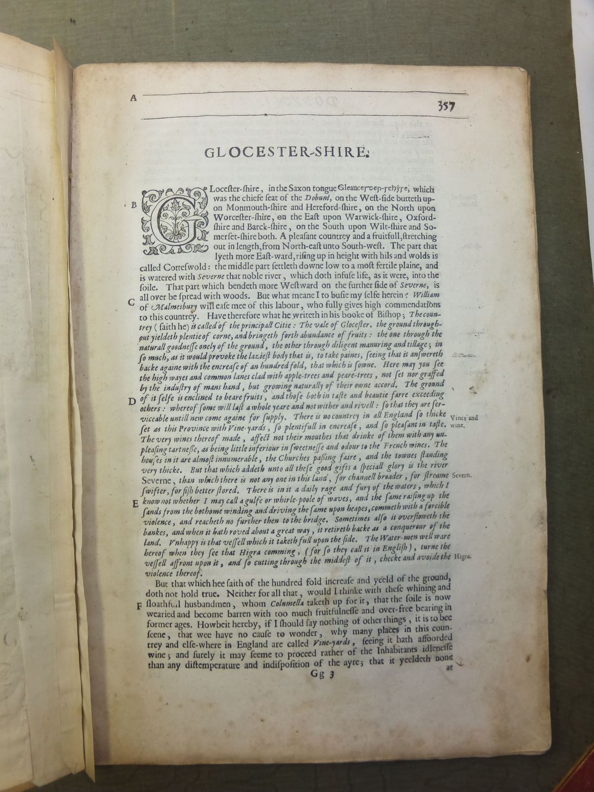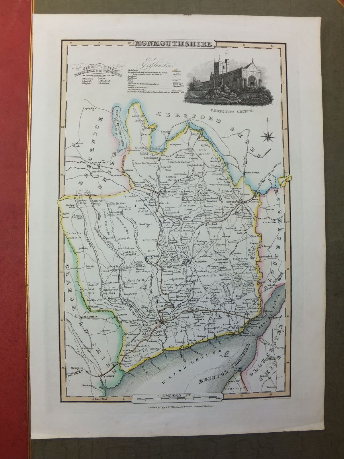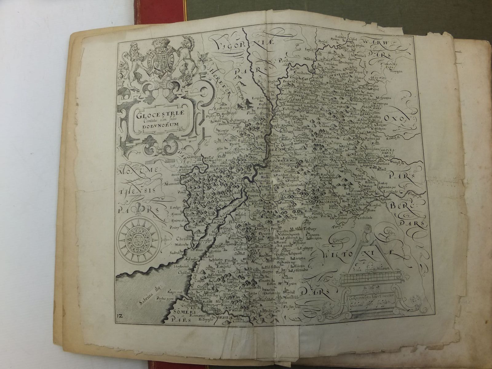 Leather spine and corners are worn with some fraying to corners. Front joint is cracked but still sound binding. Foxing throughout but heavier to prelims. Also included, loosely inserted, is a folding engraved map of Gloucestershire by Saxton Kip [c.1637] with relevant text leaves from Camden’s Britannia, repair to central fold with slight loss, few closed tears and fraying PLUS an engraved map of Monmouthshire by Pigot & Co. (hand-coloured in outline) PLUS two loosely inserted colour plates of Newport castle, c. 1784 by S. Hooper & c. 1830 by W. Westall.