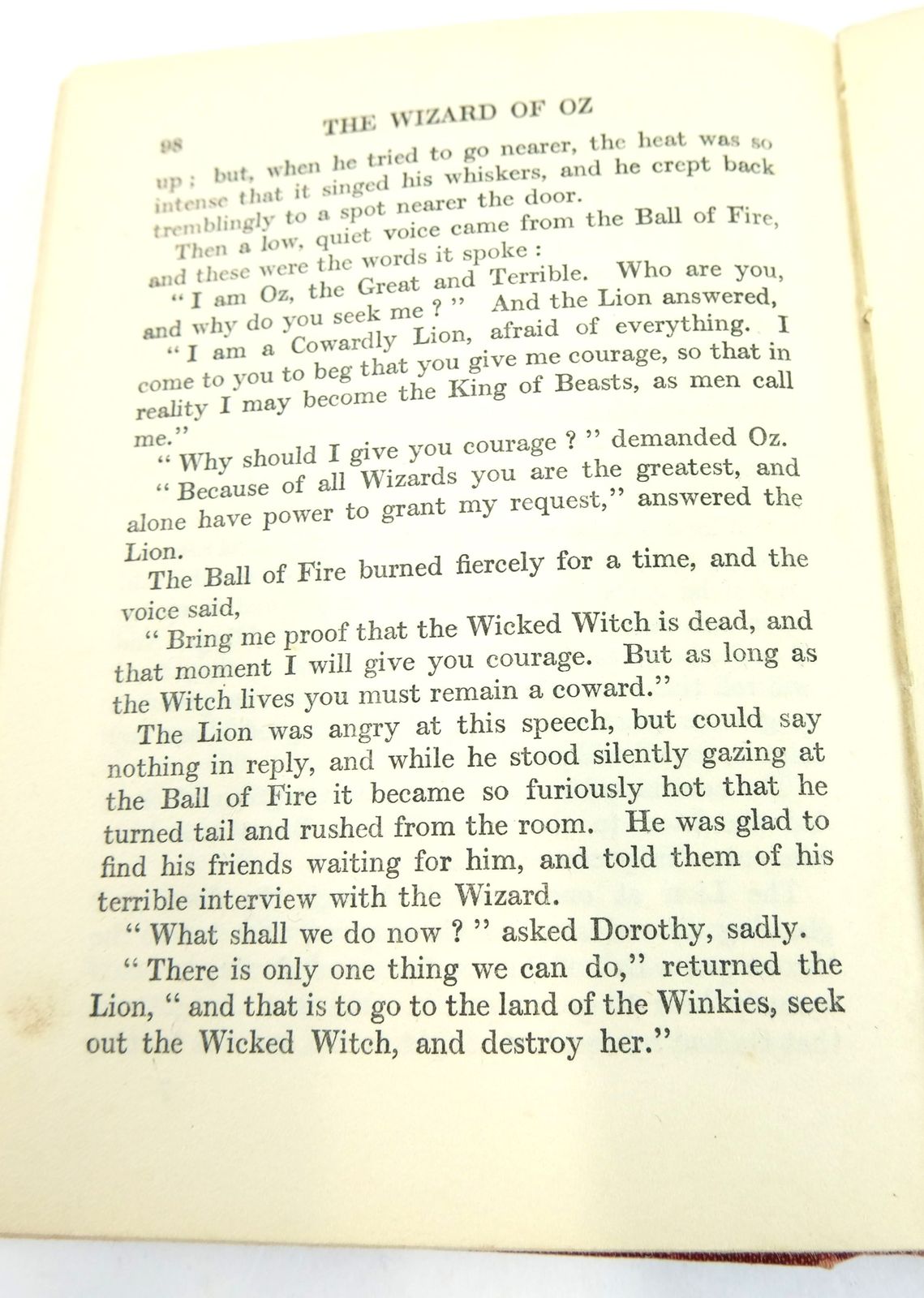 Almost very good condition. Small format. Second Edition. Red cloth boards, black title to spine. Large pictorial onlay to front picturing Scarecros and Tinman. B/w illustrations. 189 pages.