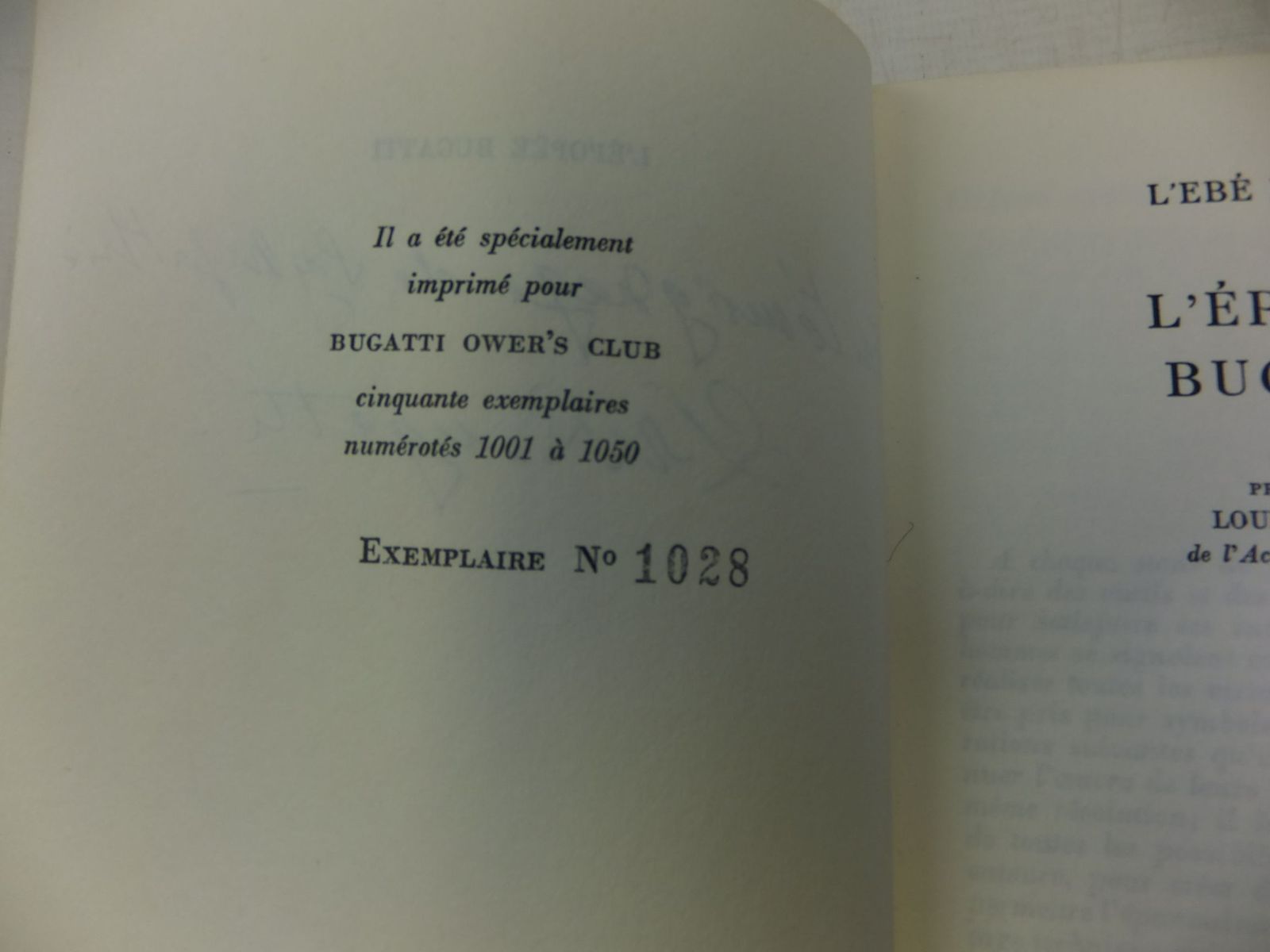 Very good condition. Special edition for the Bugatti Owners Club, numbered between 1001 and 1050. Soft cover book has been bound into hardback with cloth covers and leather title label. The Bugatti Epic. Text in French.