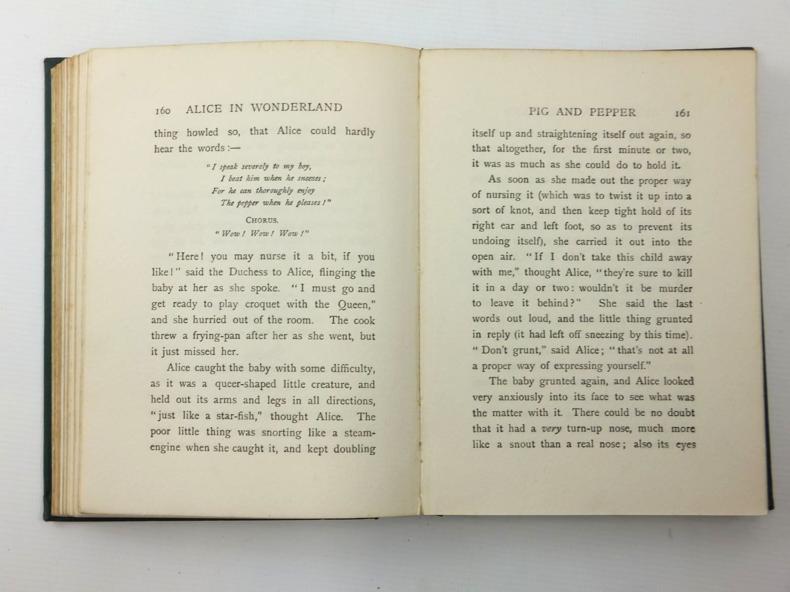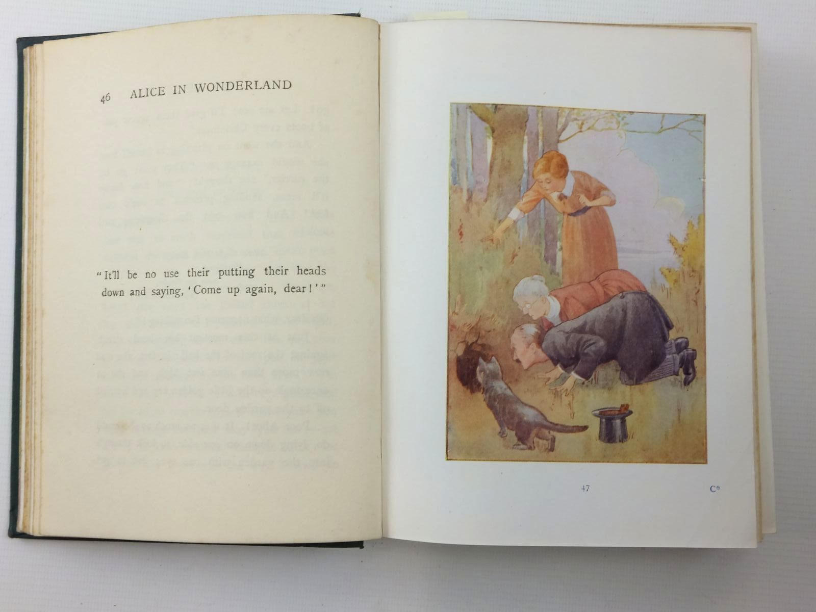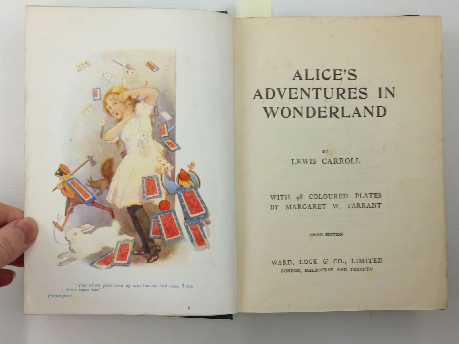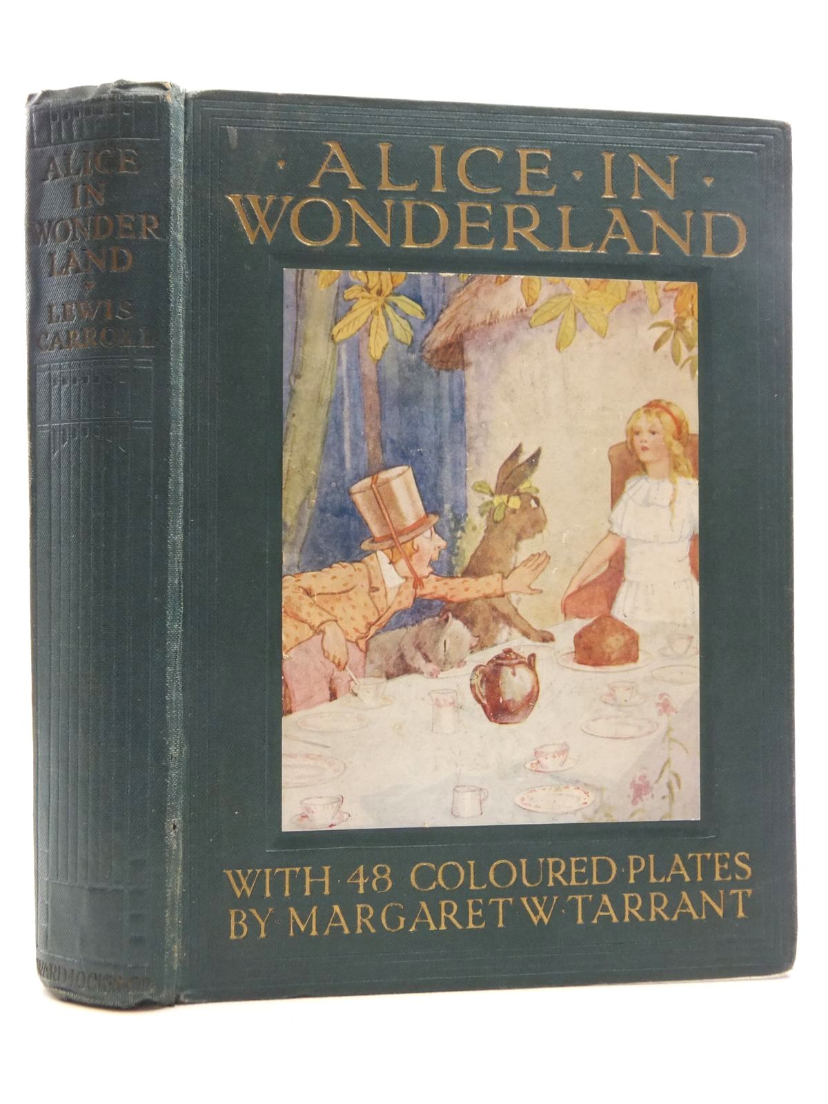 Almost very good condition. Green cloth, gilt titles and pictorial onlay to front cover depicting the Mad Hatter's tea party. Colour pictorial endpapers. 48 coloured plates. 340 pages including adverts for Wonder Books.