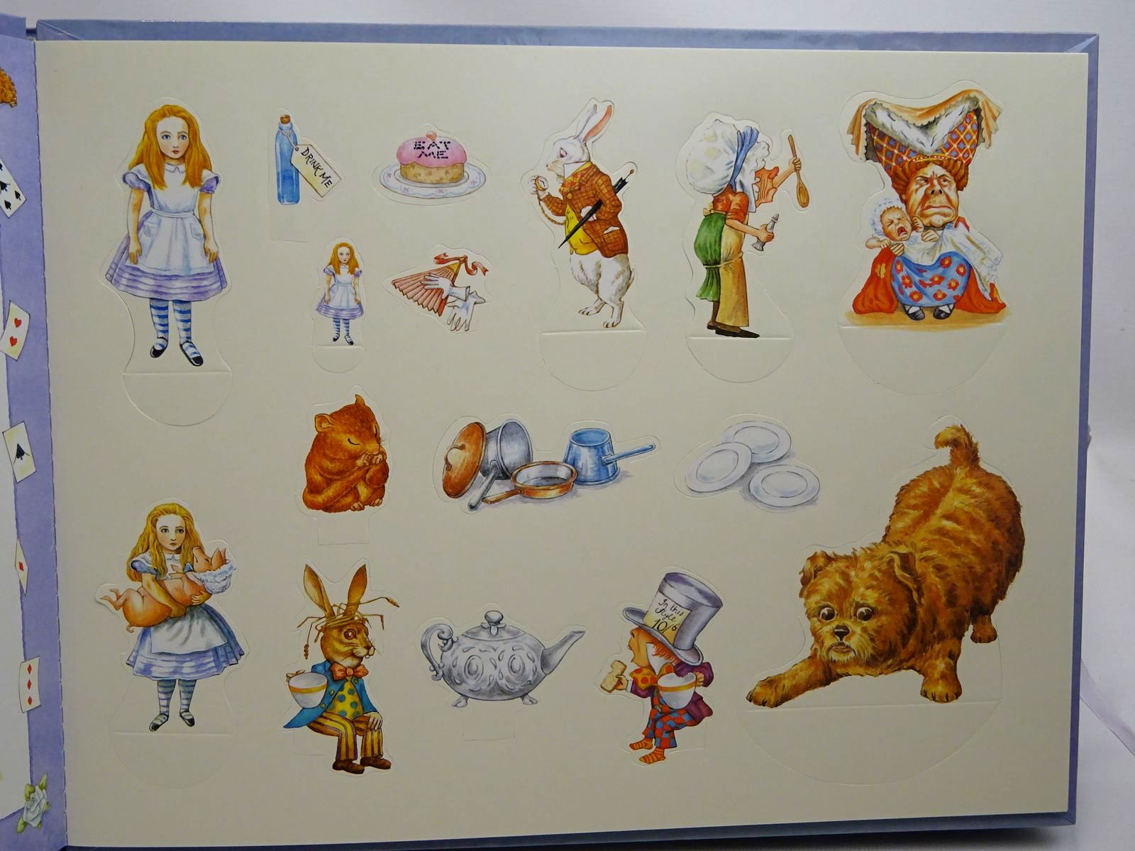 Tab to Cheshire cat is NOT working. All rest in very good working order. Press out characters have not been used - still attached to two pages of book.