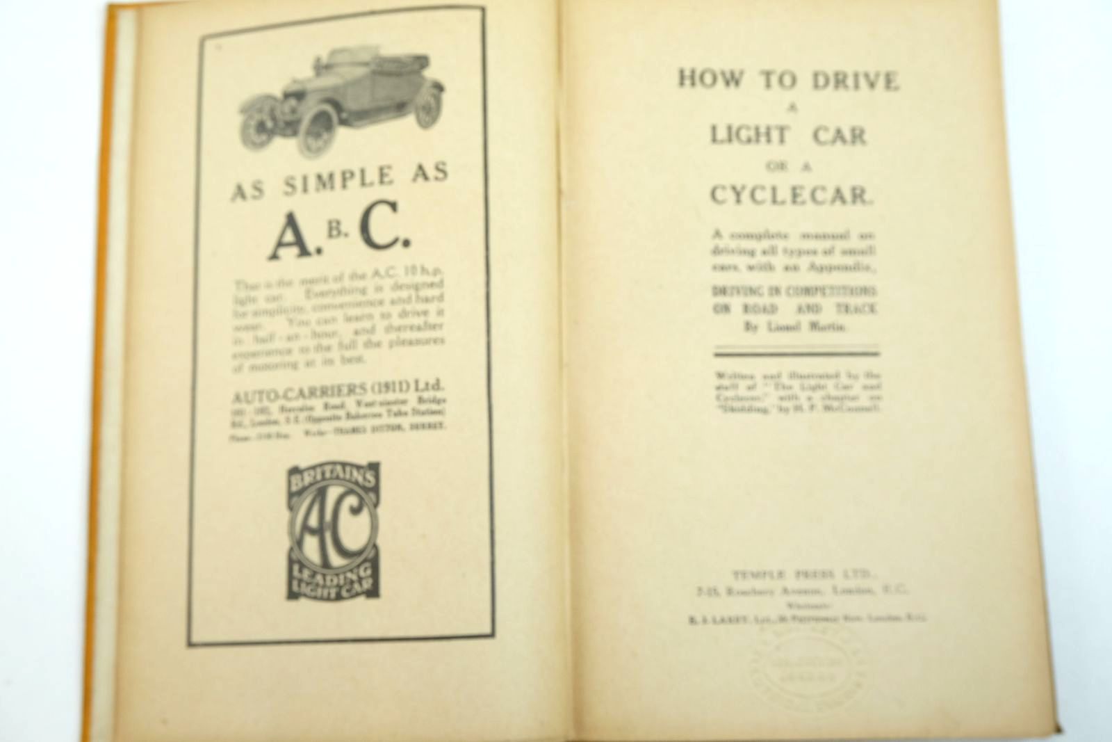 Almost very good condition. Dark yellow/orange cloth with black titles and decorations. A complete manual on driving all types of small cars, with an Appendix, Driving in Competitions on road and track.